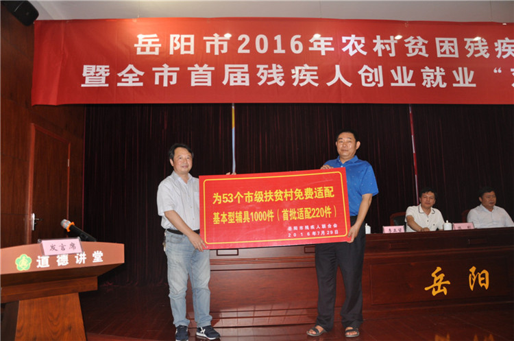 市残联党组成员、副理事长李正望发布了全市残联系统“2016年农村贫困残疾人精准扶贫行动”实施项目报告,现场举牌向53个市级扶贫村残疾人免费配发辅助器具1000件(首批适配220件)。实施项目报告指出,按照《岳阳市精准扶贫三年(2015-2017年)攻坚行动方案》文件精神,针对农村贫困残疾人受教育难、就业难、康复难、增收难等特殊困难情况,全市残联系统2016年计划重点支持415个贫困村残疾人做好精准扶贫工作,在驻村扶贫工作组的帮助下通过精准识别、精准帮扶、精准管理,让残疾人贫困户建档立卡对象和其他贫困残疾人优先享有惠残项目,从而扎实推进农村贫困残疾人精准扶贫行动,确保取得明显效果。今年,全市残联系统将向农村地区投入资金1940万元,实施九大类惠残项目,为16150人次农村贫困残疾人提供基本公共服务。惠残项目实施情况将纳入市委、市政府“一极三宜”江湖名城建设2016年度县市区综合绩效考评残疾人工作考评内容。2016年,投入1100万元,对农村600例0-14岁贫困自闭症、听障、脑瘫、智障儿童实施抢救性康复救助,救助对象免康复训练费用。每名在训残疾儿童发放1000元/年的生活和交通费用补贴。投入41万元对260名贫困精神残疾人实施免费服药和住院康复救助。其中,为50名贫困精神残疾人提供一次性住院医疗救助,为210名贫困精神残疾人提供门诊服药补贴。投入150万元,为全市农村贫困残疾人免费配发辅助器具6500件,其中市残联投入资金40万元,为53个市级扶贫村免费配发辅助器具1000件。全市免费配发肢体残疾人辅具(包括普通轮椅、座便轮椅、高靠背轮椅、座厕椅、腋拐等)2880件,听力残疾人辅具(如助听器、闪光门铃等)1600件,视力残疾人辅具(如盲杖、盲用手表、助视器等)2020件。投入80万元,实施农村贫困残疾人假肢矫形器免费装配项目210例,其中汨罗市138名农村贫困残疾人假肢免费装配任务全部纳入省残联“福彩助残健康行”活动项目。自筹经费30万元,实施农村贫困残疾人免费装配小腿假肢24例、大腿假肢12例、膝离断或髋离断假肢12例、矫形器24例。投入100万元对全市1000名有一定劳动能力的农村贫困残疾人免费进行农村实用技术培训及盲人按摩、电子商务、手机维修、定岗培训等职业技能培训。重点推进湖南成才培训学校电子商务远程教育培训授渔普及性和个性化培训项目。投入160万元扶持150名农村残疾人创业,创业扶持措施包括组织创业提升培训、提供专家指导服务、提供资金扶持等。投入70万元贷款贴息资金帮助约35户残疾人家庭和带动145名残疾人就业(增收)的残疾人就业(扶贫)基地发展生产、扩大经营规模,实现增收致富。投入30万元对约210名高中、大学阶段残疾人学生及贫困残疾人家庭子女学生进行资助,提高残疾人及残疾人子女受教育水平,完善残疾人及残疾人子女教育保障机制。投入12万元,资助20名残疾学生和贫困残疾人家庭子女学生到湖南省特教中专就读。投入资金196万元,为7020名农村肢体残疾人发放残疾人机动轮椅车燃油补贴,帮助农村肢体残疾人方便出行,参与社会。