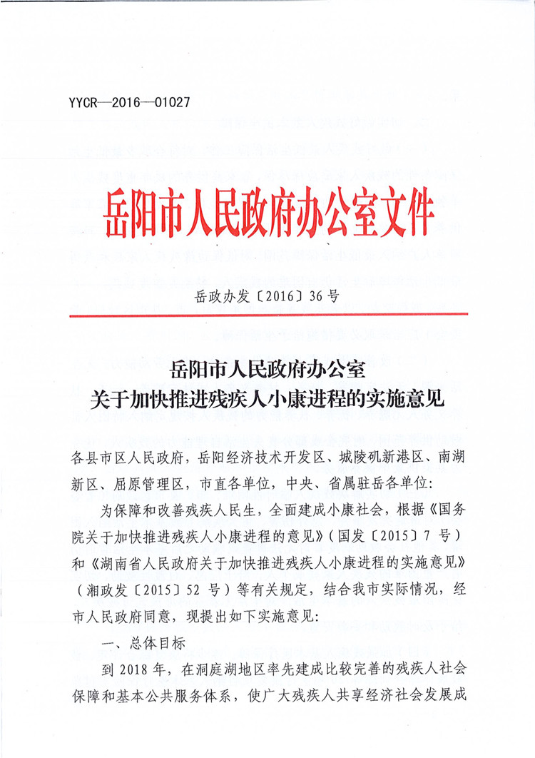 为贯彻落实《国务院关于加快推进残疾人小康进程的意见》和《湖南省人民政府关于加快推进残疾人小康进程的实施意见》等有关规定,保障和改善残疾人民生,全面建成小康社会,108日,岳阳市人民政府办公室印发《关于加快推进残疾人小康进程的实施意见》(以下简称“《实施意见》”),就加快推进全市残疾人小康进程作出全面部署。