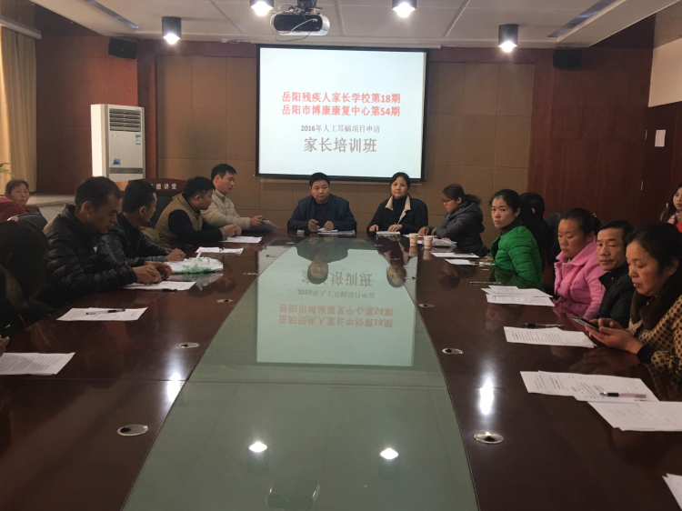 2016129,由岳阳市残联康复科主办、岳阳市博康康复中心承办的人工耳蜗项目申报家长培训班开班。本次培训班面向全市38名申请人工耳蜗项目的家长,主要对项目申请流程、表格填写、材料上报、注意事项等内容进行专题培训。