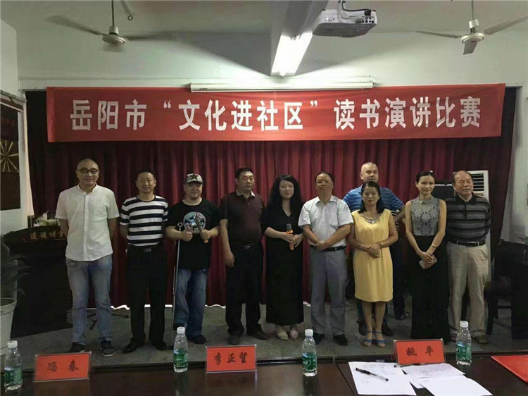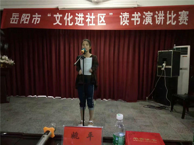 9月27日,在万家坡社区活动中心,岳阳市残联在岳阳楼区残联及社区的配合下,精心组织了一场残疾人“文化进社区”读书演讲比赛和残疾人专场文艺演出活动。湛辉辉以主题突出、口才优异、现场表现极佳一举夺得一等奖。双手皆无然而意志坚强、乐观进取的李钱赢得评委和观众的赞赏,以总分第二名的成绩夺得二等奖,张三连和马业均等分获三等奖。