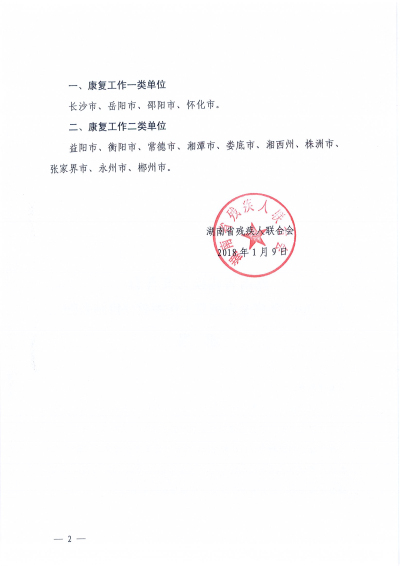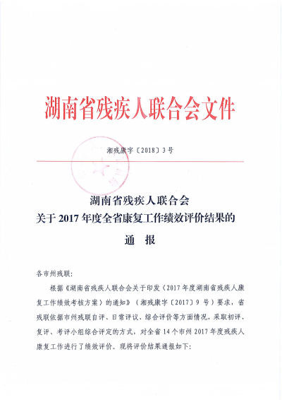 2018年1月9日,湖南省残联下发了《关于2017年度全省康复工作绩效评价结果的通报》(湘残康字〔2018〕3号),省残联依据市州残联自评、日常评议、综合评价等方面情况,采取初评、复评、考评小组综合评定的方式,对全省14个市州2017年度残疾人康复工作进行了绩效评价,我市康复工作绩效评价结果为一类单位,排名全省第二。
