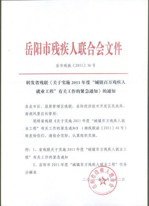 岳阳市2011年度“城镇残疾人就业工程”任务分解表