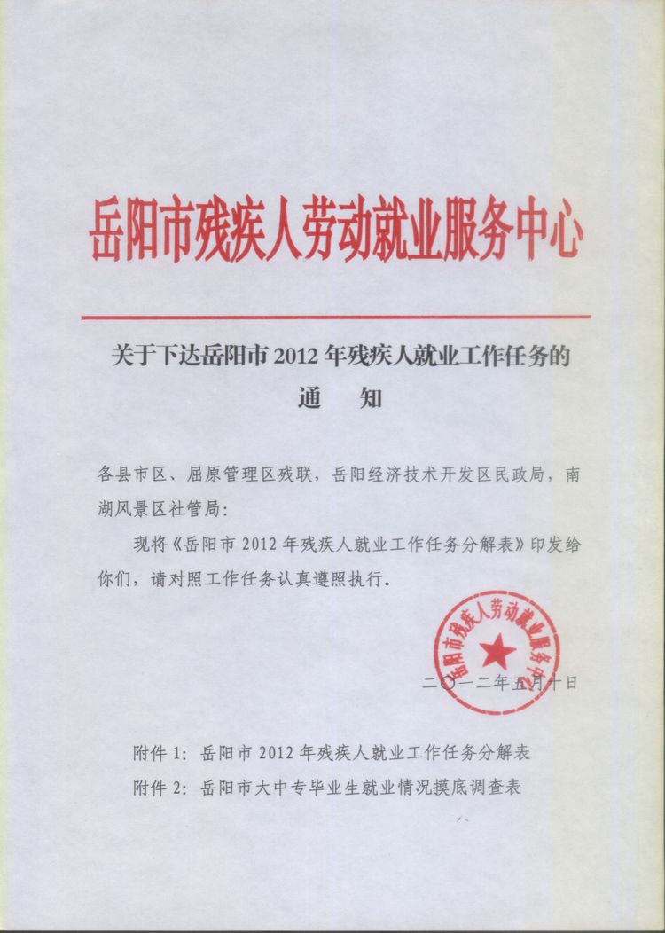 现将《岳阳市2012年残疾人就业工作任务分解表》印发给你们,请对照工作任务认真遵照执行。