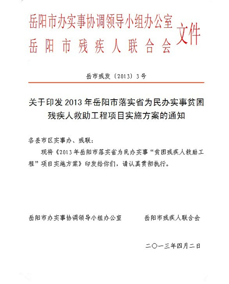 关于印发2013年岳阳市落实省为民办实事贫困残疾人救助工程项目实施方案的通知