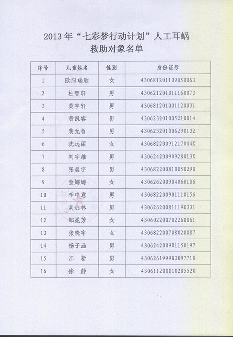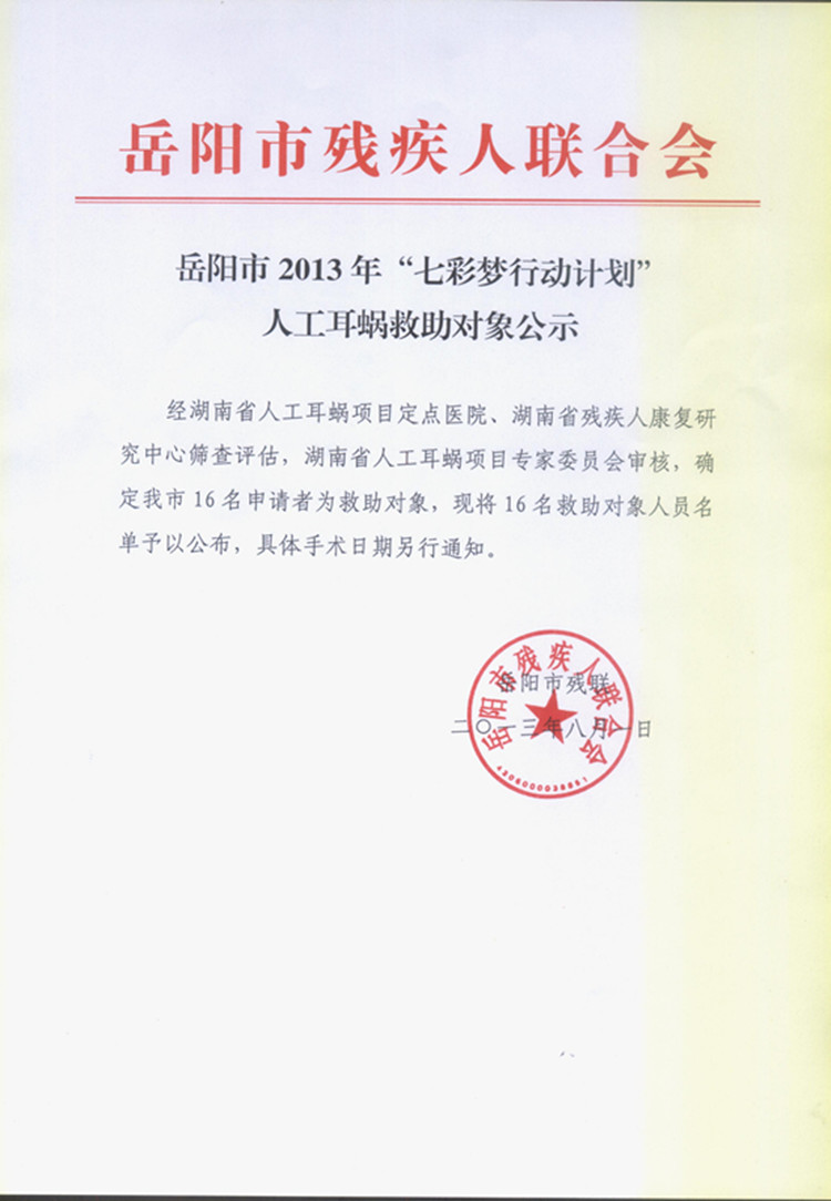 岳阳市2013年“七彩梦行动计划”人工耳蜗救助对象公示