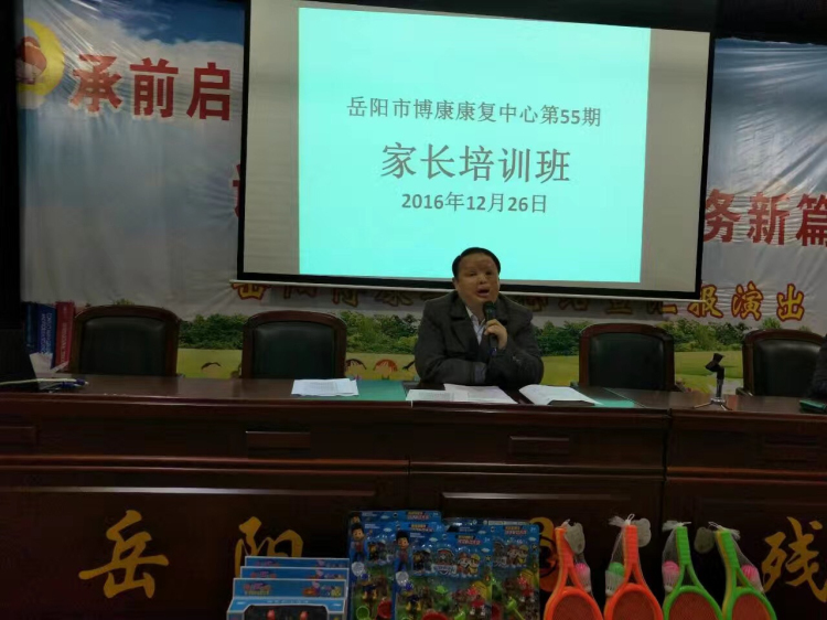 2016年12月26日,岳阳市博康康复中心举办了第55期培训班。本次培训班以感恩教育为主题,特别邀请了著名作家、岳阳市政协委员、岳阳市残疾人劳动就业服务中心主任姚平作专题报告,博康郭琪老师作《怎样学会感恩》专题知识讲座,语训部、培智部家长代表作感恩经验分享。