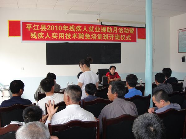 图为平江县2010年残疾人就业援助活动暨残疾人实用技术獭兔培训开班仪式