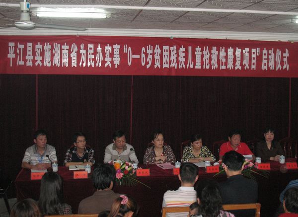 启动仪式上,定点机构就如何落实好项目实施做了表态发言。县残联理事长唐遂意对项目的实施作了进一步动员和部署,他要求平江县一定要抓住机遇,实现“五个一目标”即让残疾儿童得到一次全面康复,让家长受到一次系统培训,办好一项政府为民实事,让康复水平提升一个新的台阶,为普及康复知识创造一个宣传平台。市残联副理事长沈楠对项目实施作了重要指示,对平江县务实创新,稳步推进实施“0-6岁贫困残疾儿童抢救性康复项目”给予充分的肯定。
