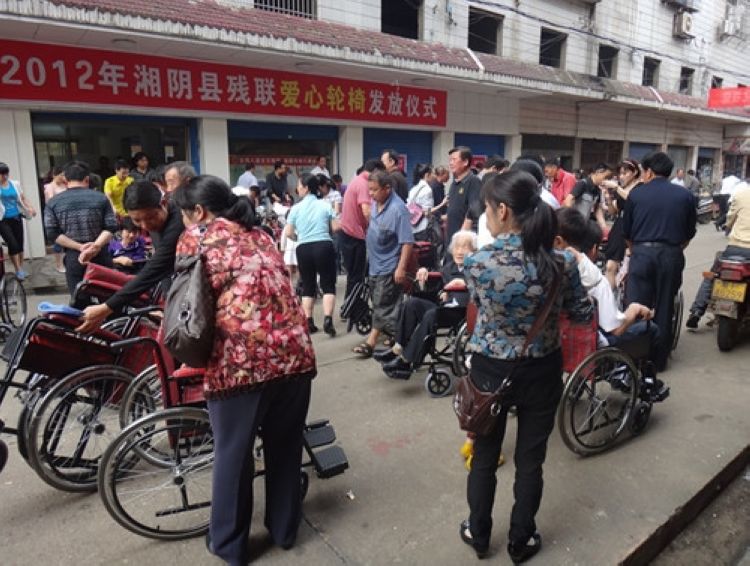 当日,在湘阴县残联机关办公楼前,湘阴县举行了2012年爱心轮椅发放仪式,免费为部分贫困重度肢体残疾人发放代步轮椅,现场共发放代步轮椅400辆。