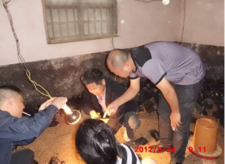 图为平江县残联宣教股长曾湘平和兽医帮助残疾人朋友查找养鸡过程中的病因