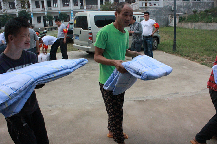 残疾孩子们接过助残志愿者们送来的慰问金和御寒棉被