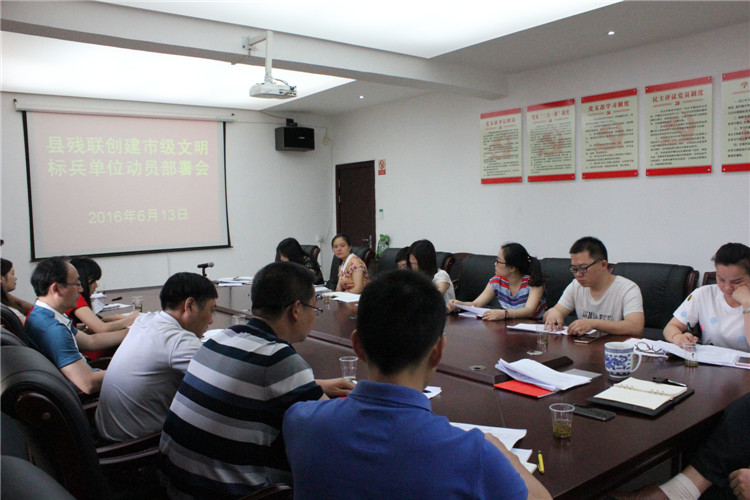 近日,岳阳县残联组织召开创建市级文明标兵单位动员部署会,全体干部职工参加。会议组织学习了《岳阳市市级文明标兵单位测评细则》,对各分管领导、各股室承担的创建工作任务进行了明确。岳阳县残联党组书记、理事长刘滔出席会议并作动员报告。