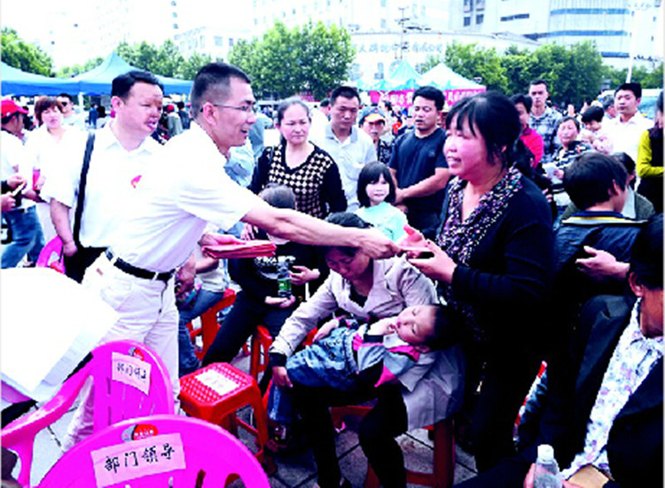 ④在2013年第23次全国助残日主题活动现场,湖南拓福家纺有限公司总经理危李向湖南省残疾人福利基金会岳阳市分会捐赠10万元。