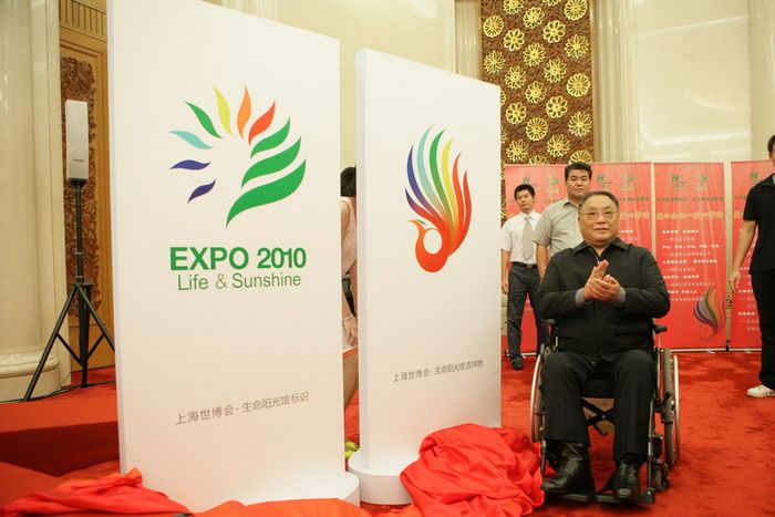 图为全国政协副主席、中国残联名誉主席邓朴方同志为上海世博会生命阳光馆标识和吉祥物揭幕