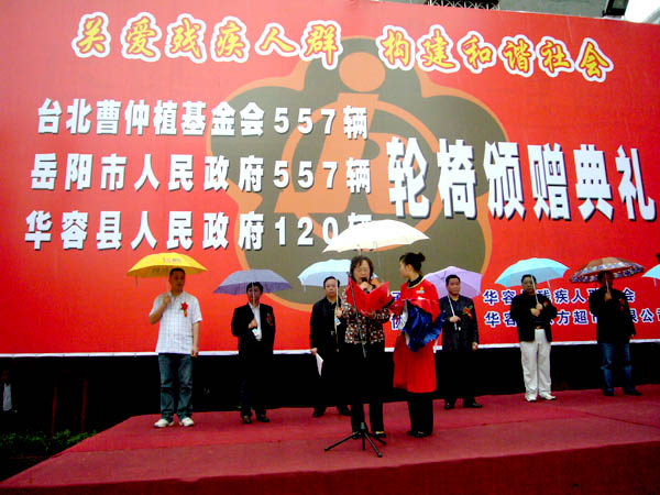 5月16日,第19个法定全国助残日到来之际,台北曹仲植基金会和湖南省岳阳市人民政府联合捐赠1114辆残疾人代步轮椅活动在华容县举行隆重的中心现场颁赠仪式,免费获赠轮椅的华容县120位残疾人及其亲友喜笑颜开,两位残疾农民拉着华容县副县长蔡勋华的手说:“今天真是我们的节日啊!”据悉,1990年以来,台北曹仲植基金会已连续多年为祖国大陆残疾人联合捐赠代步轮椅29万辆,其中为岳阳市残疾人联合捐赠了4620辆。岳阳市残联副理事长沈楠代表全市残疾人衷心感谢海峡两岸爱心人士长期以来对岳阳34万残疾人的深情扶助,同时希望全社会继续高扬人道主义旗帜,搭建起更多更高更好的扶残助弱爱心平台。