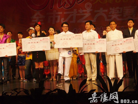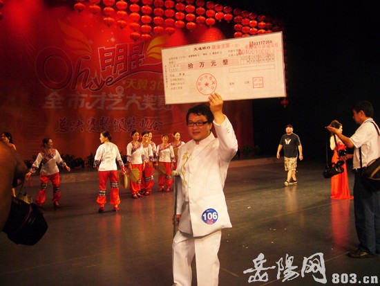 残疾歌手游舰欣喜万分地手捧10万元奖金支票向现场观众致意。