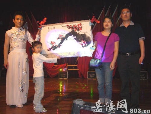 艺术团无臂书画家现场用嘴叼笔创作的《梅花斗寒图》赠送给了岳阳盲人歌手于蓉。