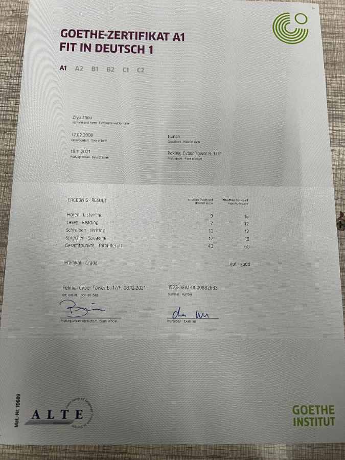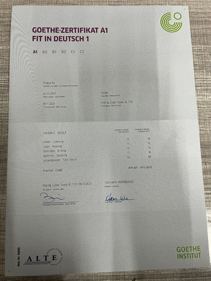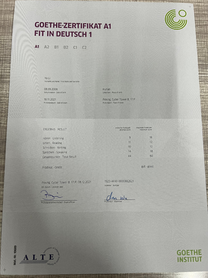 此前,三名同学分别以52、44、43的成绩(满分60)通过了欧标德语A1等级考试,并获得证书。