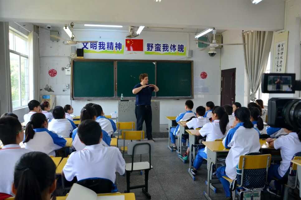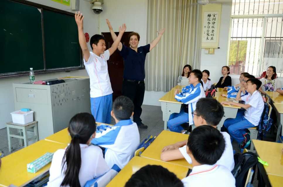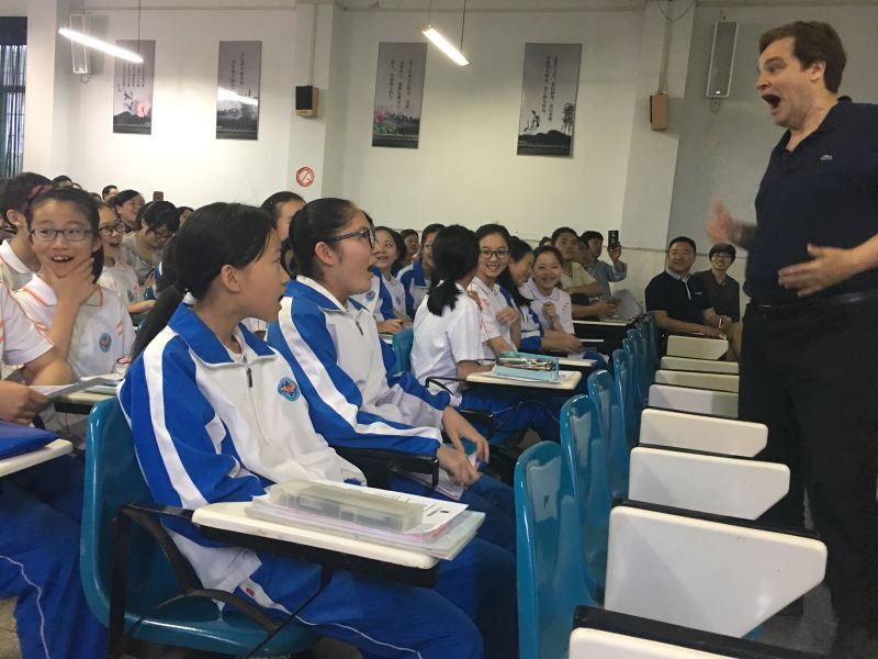 5月18日上午,天气晴朗,上午8点,约翰·哈特先生以及省教育国际交流协会和市教体局相关人员就到达我校,准备开始当天第一个重要行程:跟学生上课。我校初一116班与高一177班有幸能够感受约翰·哈特先生的魅力。上午第一节,约翰·哈特先生指导初一116班学生进行relax(放松)训练。第三节,在约翰·哈特先生的指导下,177班同学完成了一段话剧表演。即通过即兴表演、写作等方式,对学生的自我表达进行完善、提高语言技巧、培养学生的领导能力。事实证明,这样的训练确实有效。同学们深情并茂的完成了话剧表演。