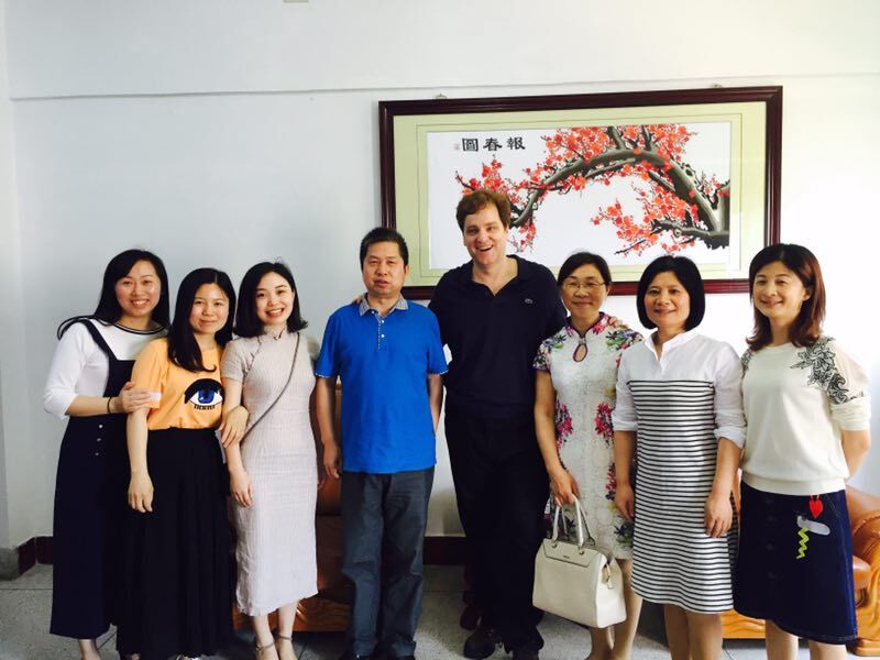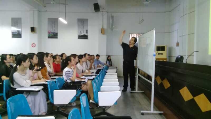 除了学生以外,约翰·哈特先生也为我们岳阳市的老师带来了福利。当天下午2点半至4点半是约翰·哈特先生的讲学时间,来自我市的190多名英语老师参加了约翰·哈特先生的讲演,老师们受益匪浅。讲演结束后,老师们争相与约翰·哈特先生合影。