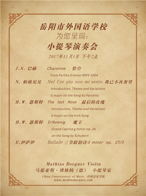 我们有幸邀请到了中国音乐学院特聘的小提琴教授-鲍格纳(Mathias Boegner)来我校为师生呈现一场精彩绝伦的演奏会。鲍格纳是德国、瑞士籍小提琴家,曾师从多位名家教授,获得多项全球奖项。凭着对音乐的极度热爱和对教育的关心,他走遍了很多学校,为许多学生带来了可能是人生中的第一次音乐会。