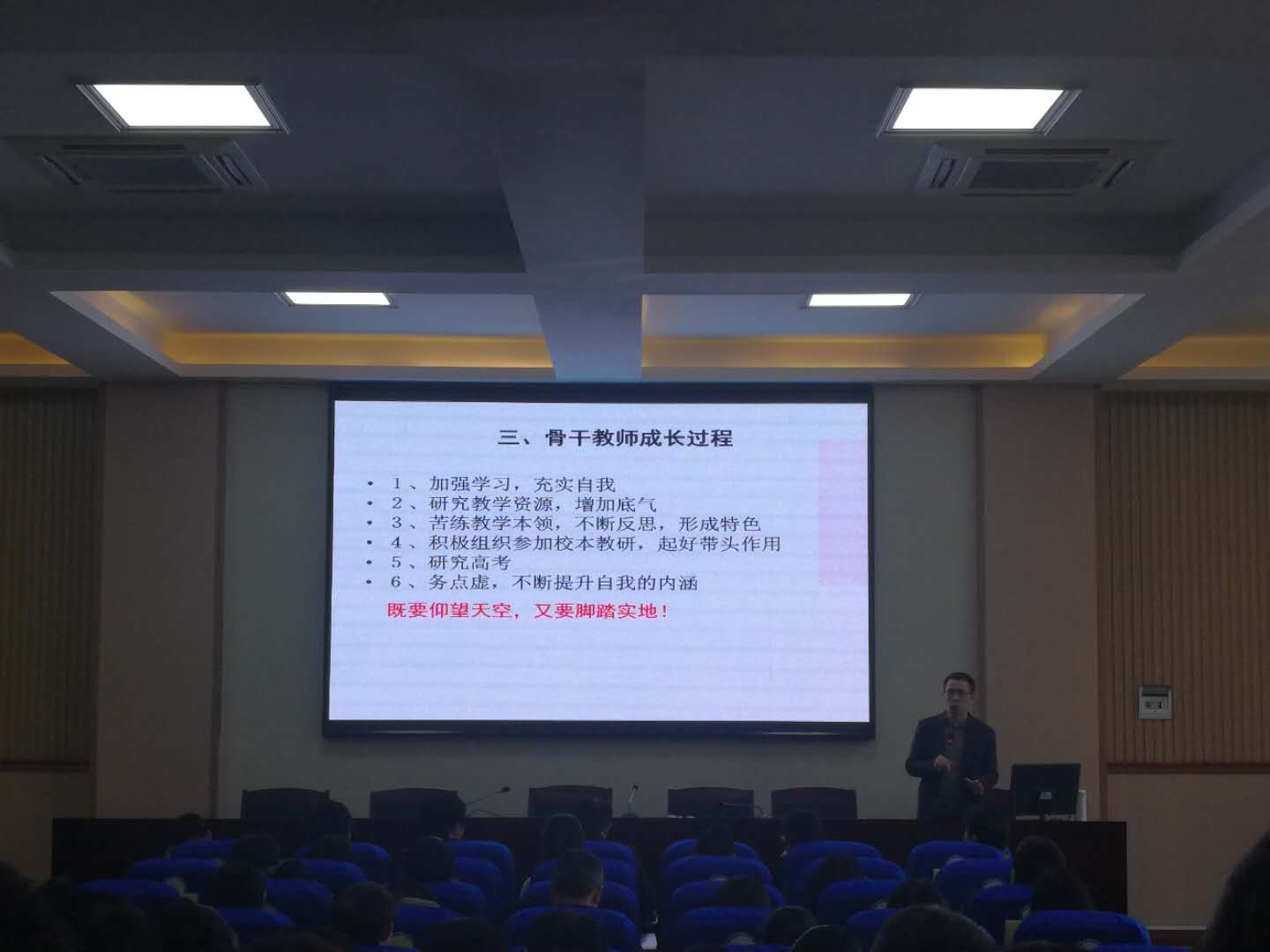 李华老师以《争做一名学生喜欢的老师》为题,结合自身教学经验,兼谈教师专业发展之路,重点为大家讲解了三个方面:一是骨干教师专业发展路径,成为骨干教师要有理想,有思想,勤奋工作,热情待人,不懈坚持,善于积累,善于总结。二是骨干教师应具备的基本素质,三个观点,即骨干教师应为自身的发展不懈努力;应为学生成长的促进者;应为学校发展的主力军。七种素质,即热爱教育的思想;强烈的责任感;热爱学习;有扎实的专业知识;娴熟的教学技能;积极参与教育教学科研;健康的身体素质。三是骨干教师成长过程。要加强学习,充实自我;研究教学资源,增加底气;苦练教学本领,不断反思,形成特色;积极参加校本教研;研究高考;务点虚,不断提高自我内涵。