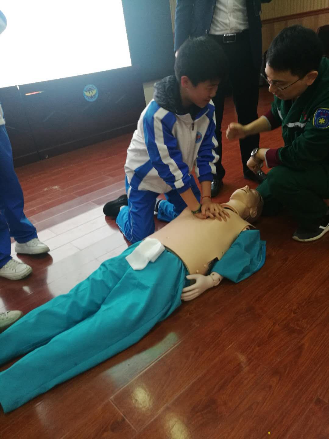 接下来,市二医院的急救医生为同学们讲解了现场救护的原则和相关技能,以及心肺复苏等急救知识。在讲解心肺复苏术时,急救医生现场使用人体模型作模拟示范,对胸外按压的部位、频率、深度和气道开放消除异物的方法以及人工呼吸的要点进行了详细讲解,手把手地教同学们如何进行心肺复苏操作。同学们听得非常投入,反响热烈并积极参与,每一名同学都在专业人员的指导下进行了现场练习。