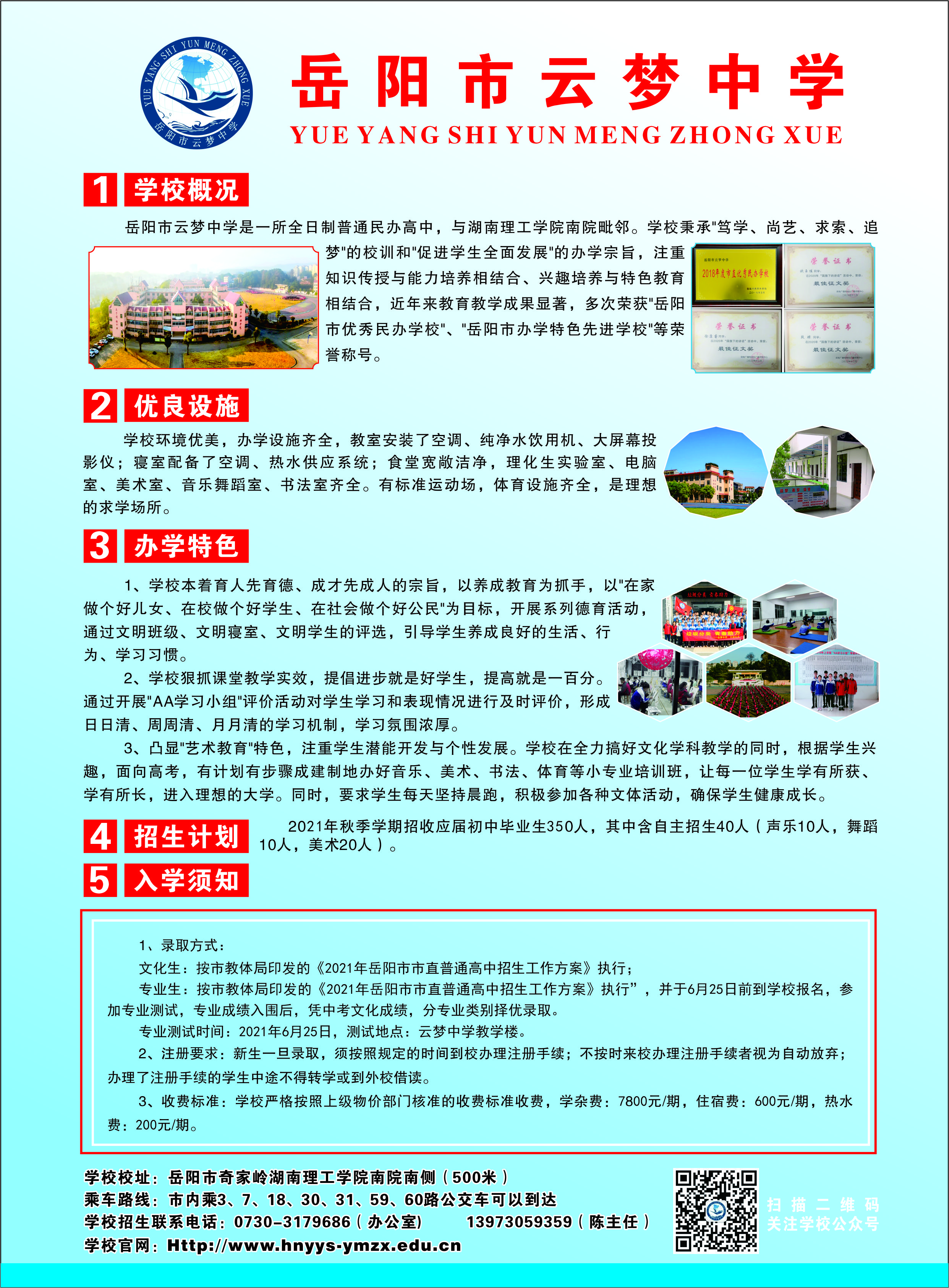 2021年秋季学期招收应届初中毕业生350人,其中含自主招生40人(声乐10人,舞蹈10人,美术20人),报名时间6月12日至6月24日,面试时间6月25日。