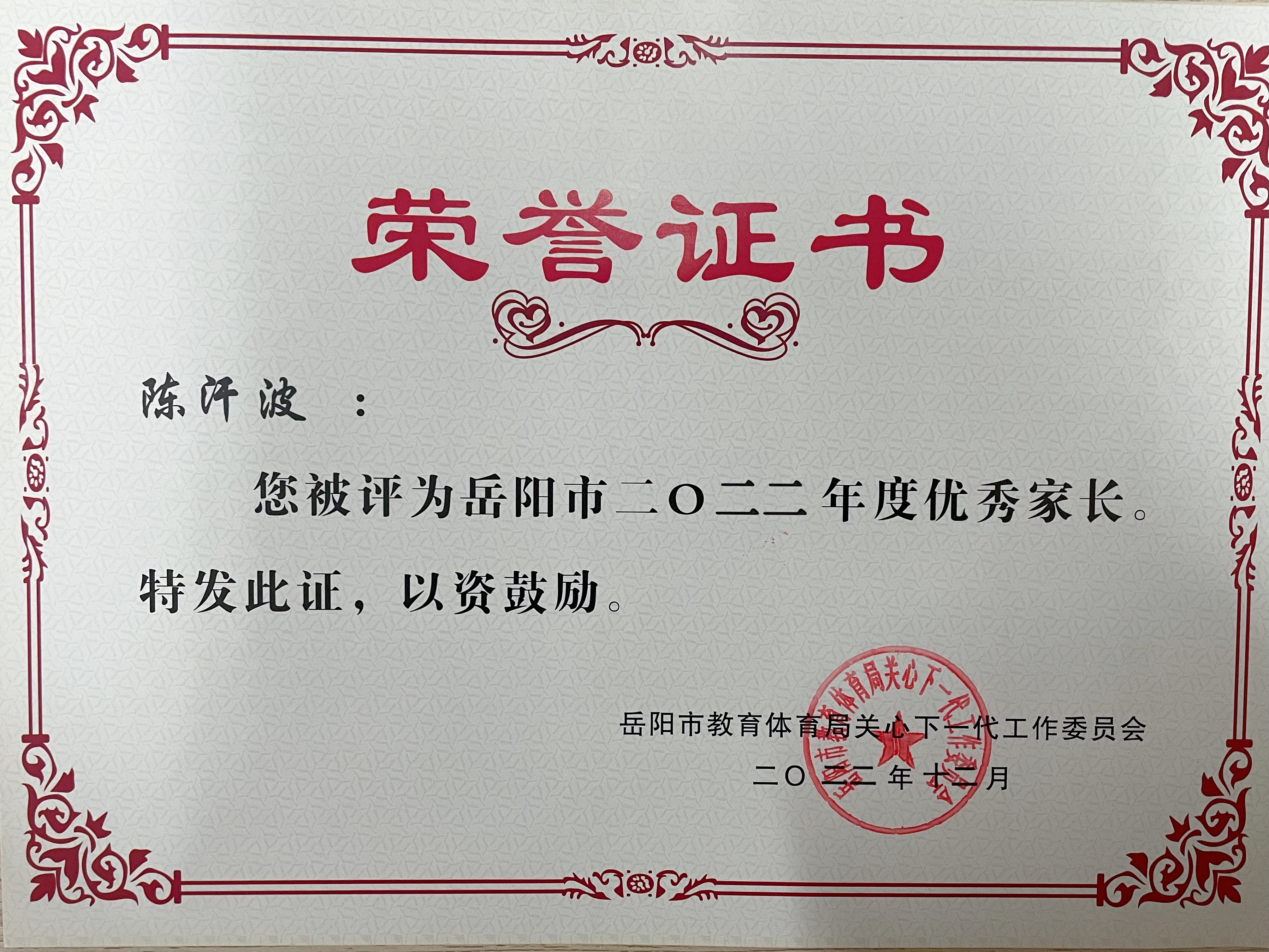 热烈祝贺我校高三年级136班陈珉宇的家长被评为岳阳市2022年度优秀家长