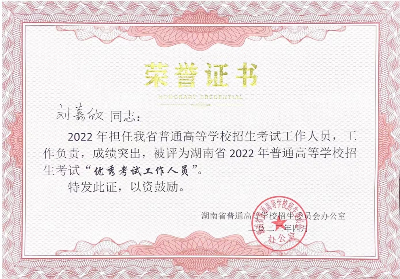 祝贺我校刘嘉欣老师被评为湖南省2022年普通高等学校招生考试“优秀考试工作人员”