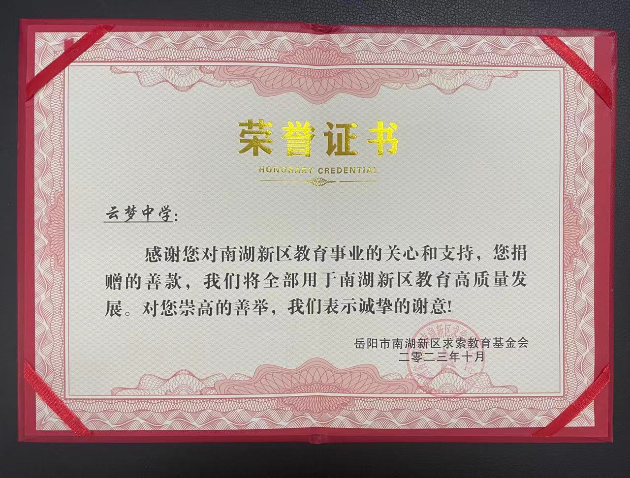 云梦高级中学2023年10月20日向岳阳市南湖新区求索教育基金会捐赠10000元善款,大力支持南湖新区教育高质量发展。