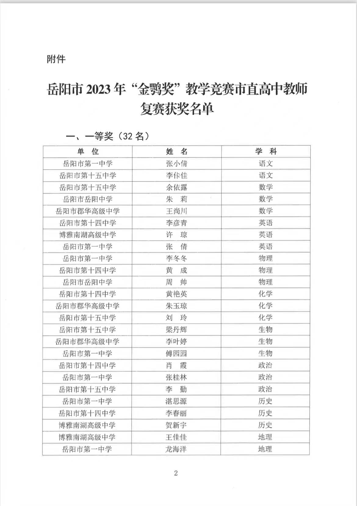 热烈祝贺我校任巧老师在岳阳市2023年“金鹗奖”教学竞赛市直高中教师复赛中荣获二等奖。