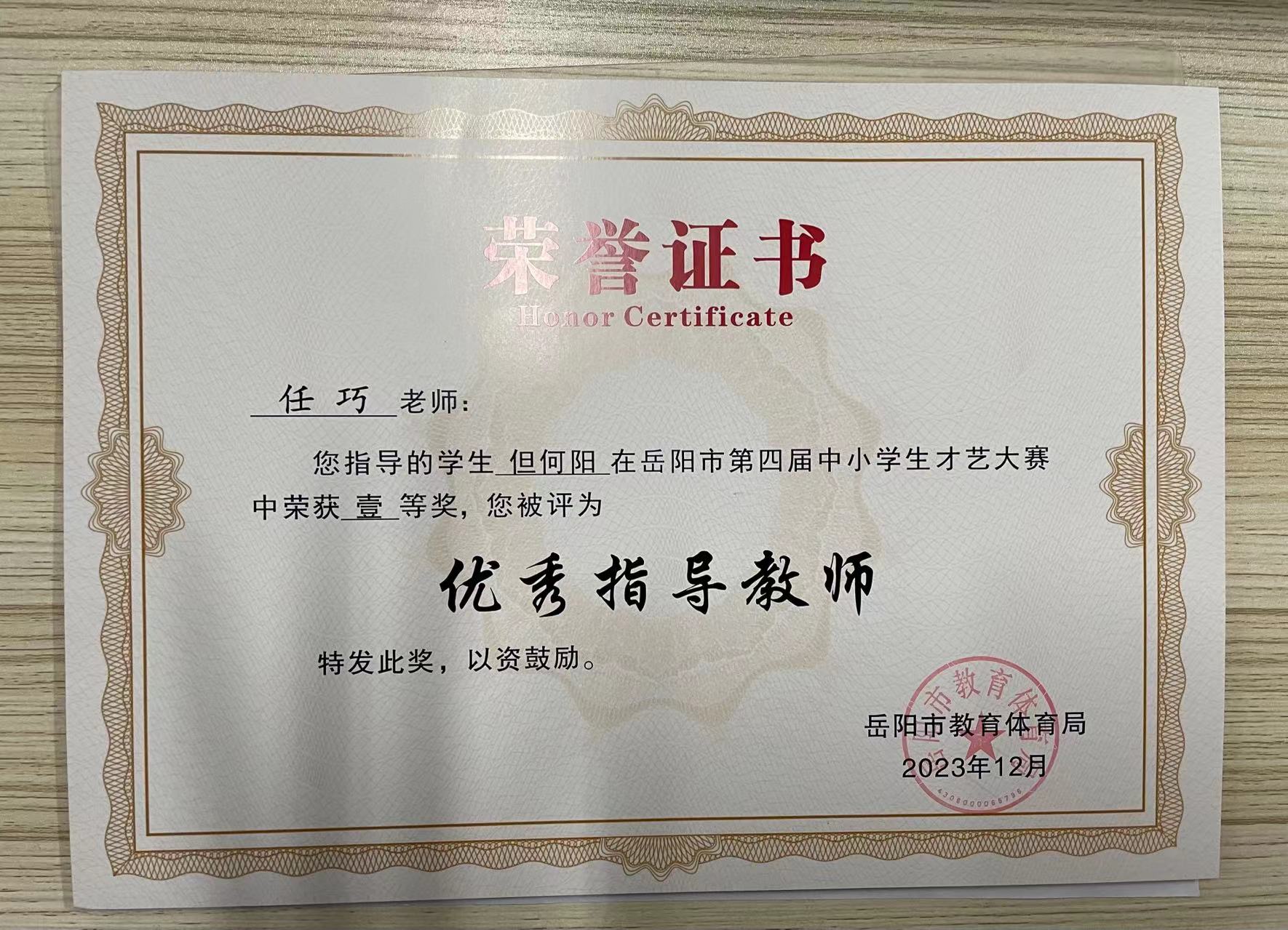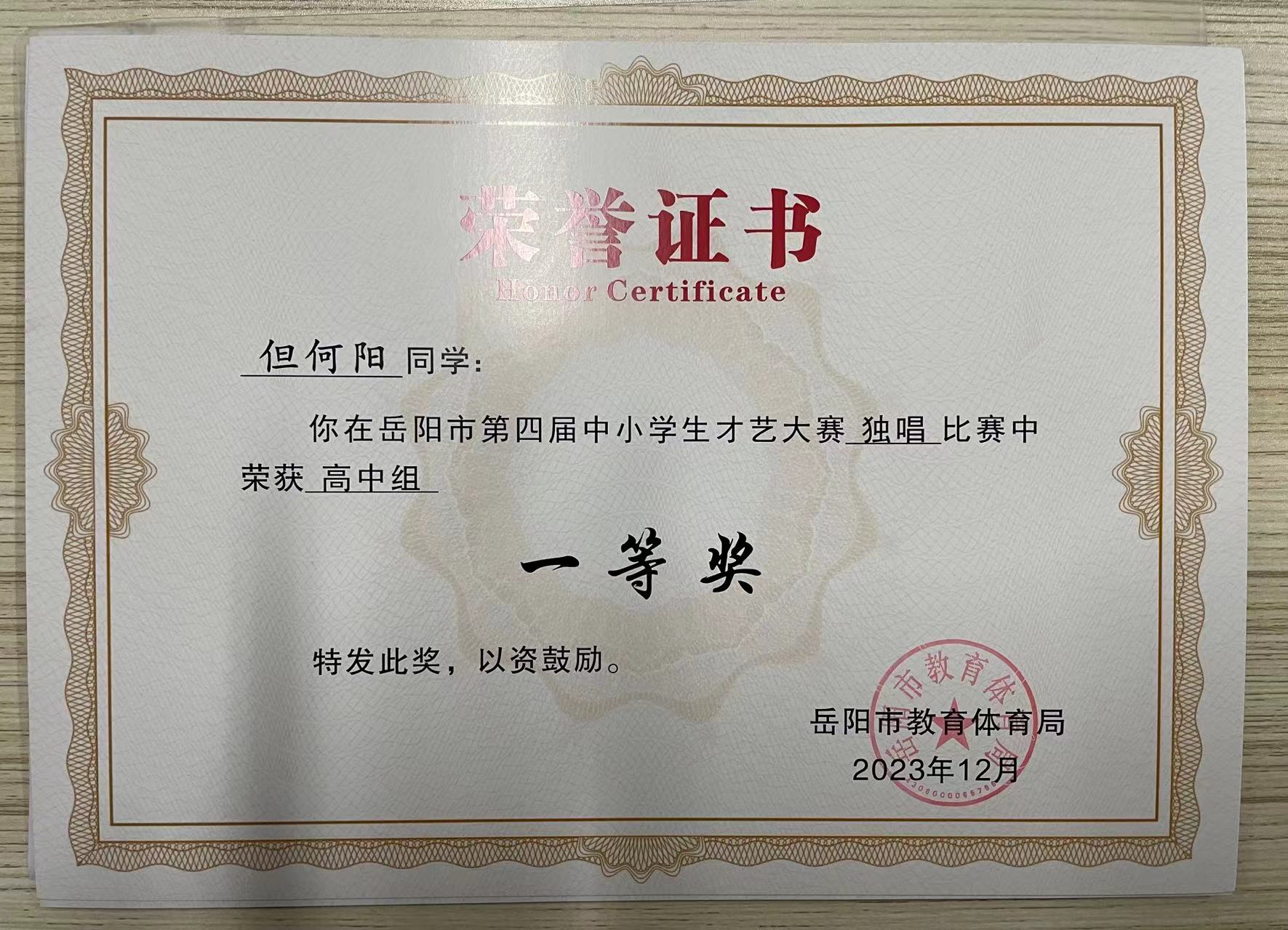 热烈庆祝由我校任巧老师指导的高二年级153班但何阳同学荣获岳阳市第四届中小学才艺大赛独唱高中组一等奖