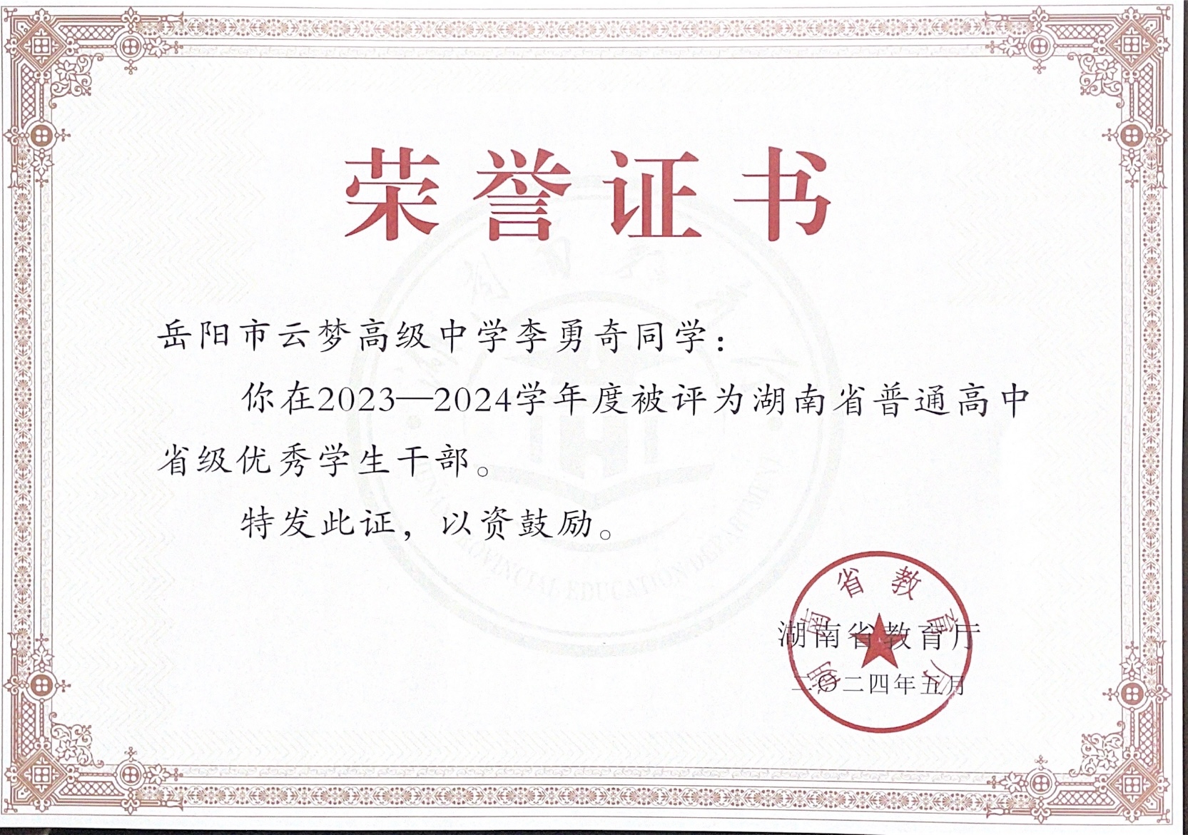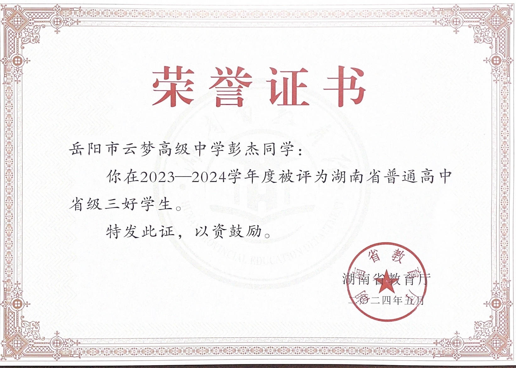 同学被评为2023——2024学年度湖南省普通高中省级三好学生、优秀学生干部