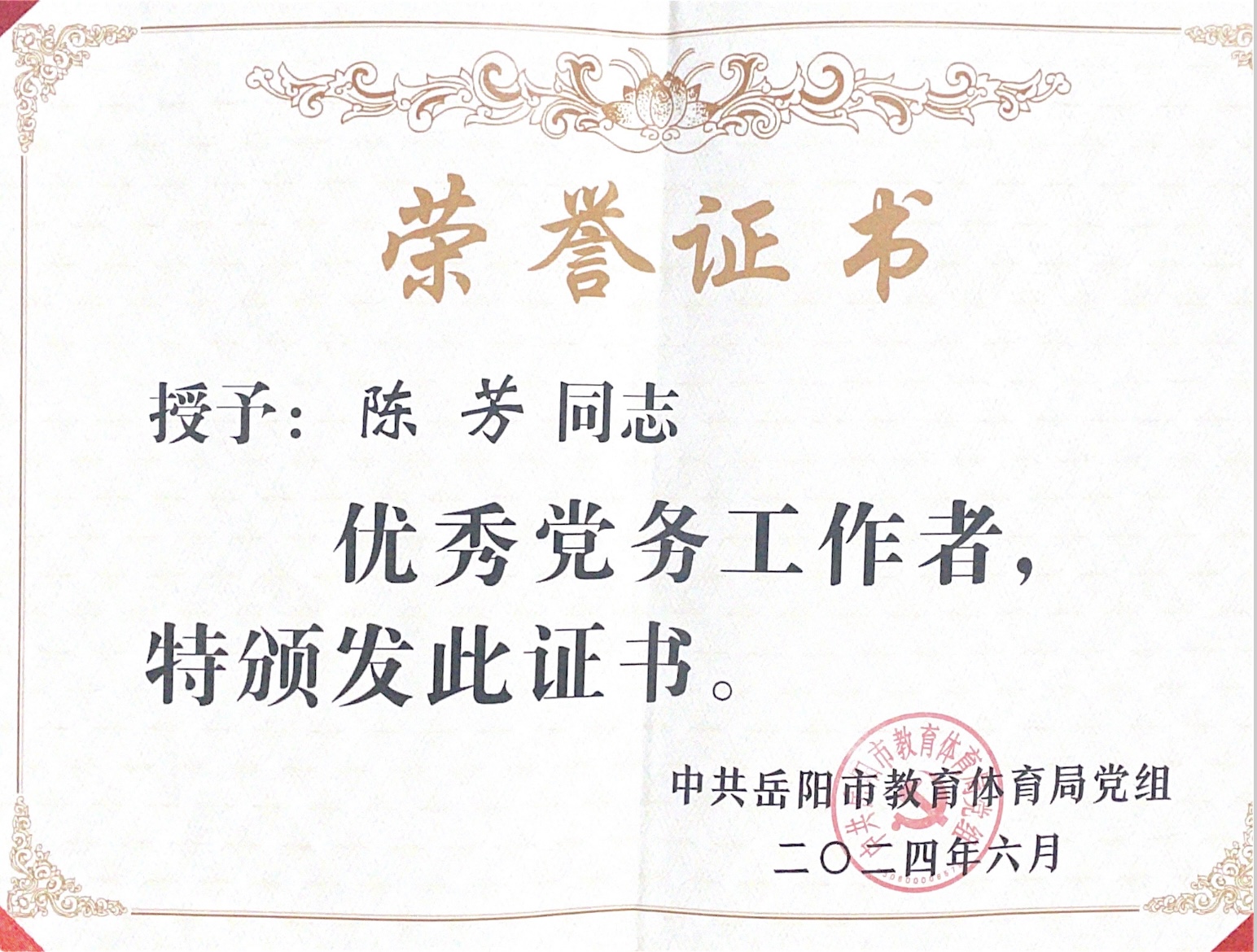 热烈祝贺我校陈芳同志被中共岳阳市教育体育局党组评为“优秀党务工作者”