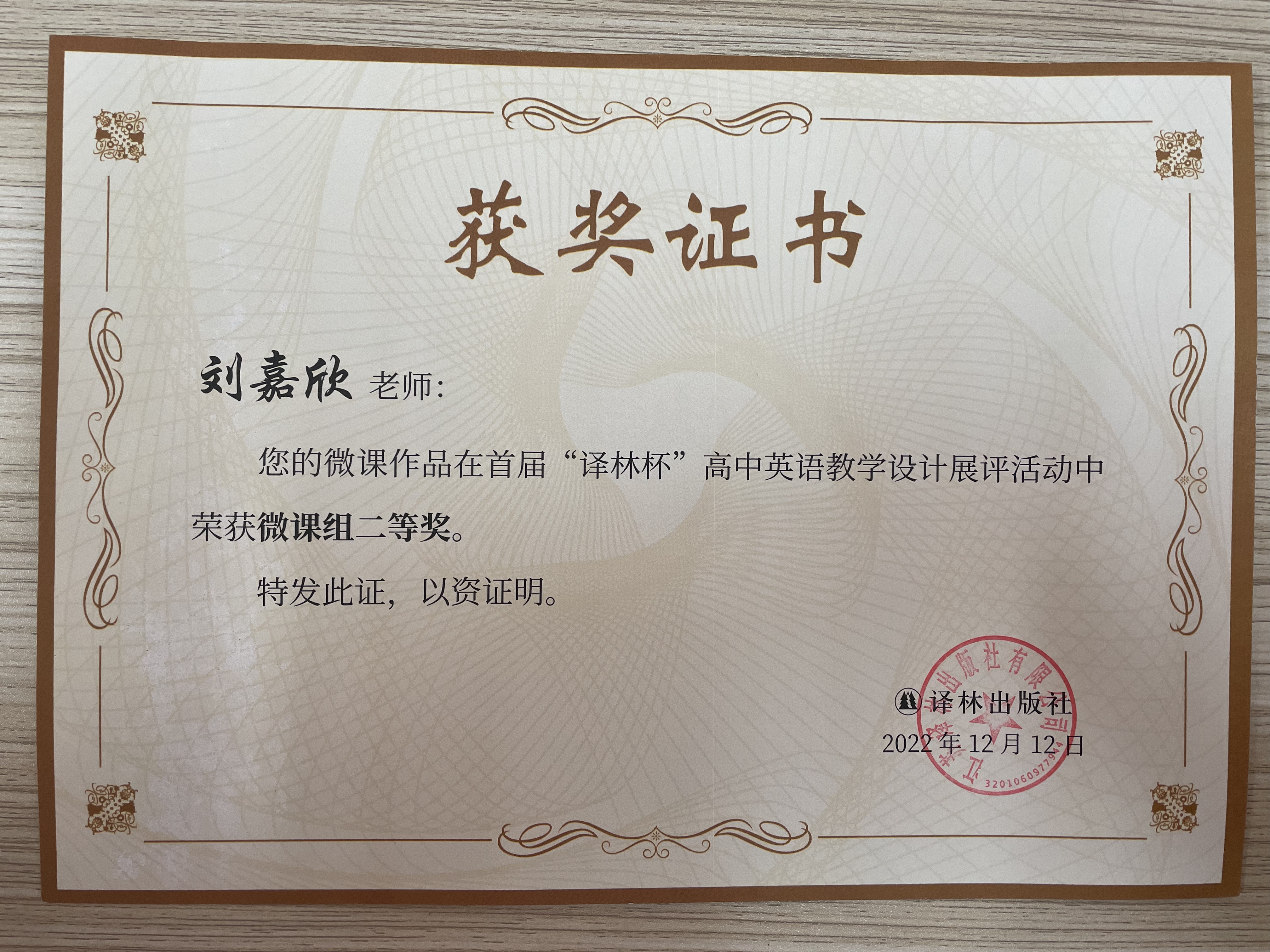 祝贺刘嘉欣老师的微课在首届“译林杯”高中英语教学设计展评活动中荣获微课组二等奖