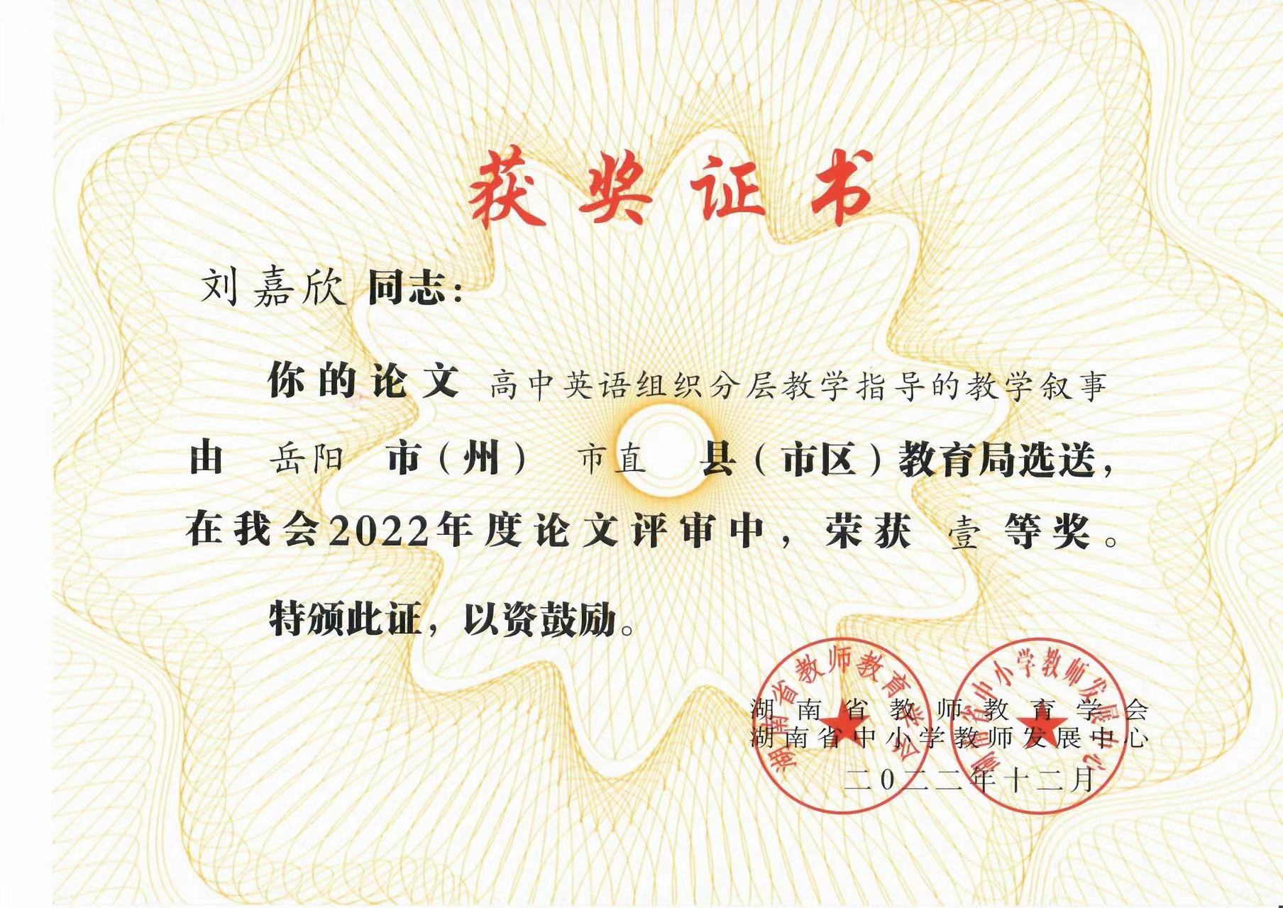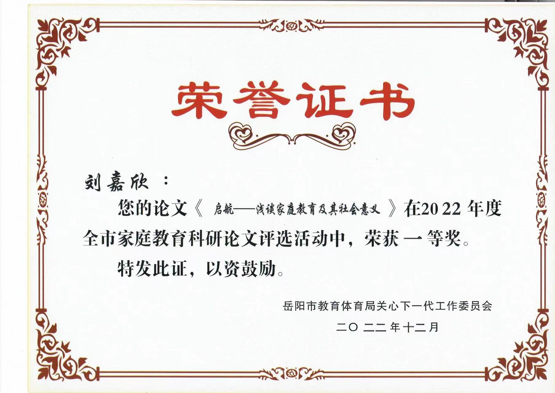 刘嘉欣老师论文获奖