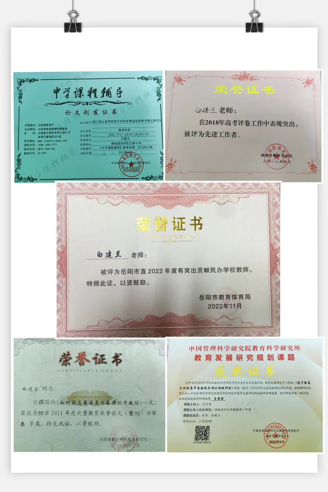 白建兰,本科学历,中学英语高级教师。2001年8月从教,担任中学英语学科的教学工作。在22年的教学生涯中,先后担任过班主任、高中英语备课组长及教研室主任,多次担任高三毕业班教学工作。通过多模态教学促使学生积极主动进行知识探索,深入了解知识内涵,并创新现有的教学方法,丰富学生的体验,增强学生的学习主动性,加深学习体验,以获取最优的学习效果为原则,提升学生的语言能力、文化品格、学习能力以及思维品质等,培养高素质人才。教学成绩突出,多次被评为云梦高级中学优秀教师,并获得了岳阳市有突出贡献民办教师荣誉称号。参与国家、市、区级多个课题研究,先后有多篇论文、案例分别获国家级、市级的一、二、三等奖或在省、市刊物上发表。