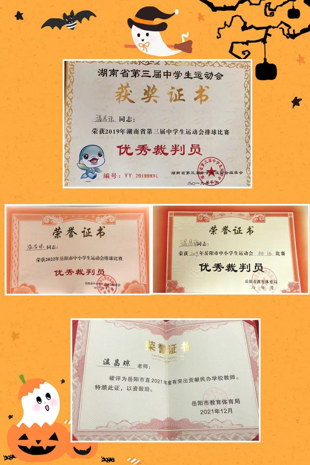 温昌琼,本科毕业,国家一级运动员。从教以来,一直担任中学体育老师、体育高考生教练员以及体育班班主任。在班级管理中,注重培养和谐融洽的师生关系,营造简单快乐的学习氛围,渗透爱和尊重的情感体验。在体育教学及专业培训上,关注孩子的个体差异,重视学生的内心感受,贯彻落实“达则兼济天下,穷则独善其身”的做人理念,坚持用自己的言行举止去引导学生。温老师自参加工作以来,多次获得省级以及市级排球优秀裁判员、优秀运动员称号。在2019年代表岳阳市参加湖南省体育系统气排球赛,取得一等奖的好成绩,同年在湖南省第三届中学生运动会担任排球裁判,并获得省级优秀裁判员证书。作为一名刚毕业的“新手教练员”带的第一届专业生就送出多名学生进入大学继续深造。温老师多次在校级青年教师比武中取得好成绩,并于2021年被评为岳阳市直年度有突出贡献民办学校教师