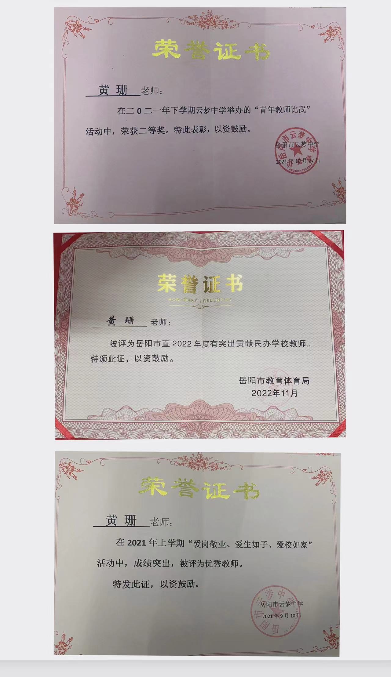 黄珊,本科学历,中学英语教师。2015年8月从教,担任中学英语学科的教学工作。在9年的教学生涯中,先后担任过班主任、年级主任。在班级管理中,她以制度为准绳,培养学生的良好习惯,是严师;她平等地对待每一个学生,善于发现他们细微的心理变化,并适时地给予心理疏导,是学生们的心灵导师;她极有亲和力,是学生们的知心大姐姐。专业能力上,她精益求精,积极探索,潜心钻研,不断地雕琢自己,教学水准不断提高。在课堂教学中,她充分关注每一个学生,调动学生积极性,挖掘学生潜力,促进学生思维发展。因为用心,她所带的班级班风正、学风浓、成绩优异,曾多次获得“文明班级”、“优秀班级”荣誉称号,所带的136班陈珉宇同学的家长也被评为“岳阳市优秀家长”,她本人也多次获得学校“优秀教师”和“优秀班主任”荣誉称号,2022年荣获岳阳市有突出贡献民办教师荣誉称号。
