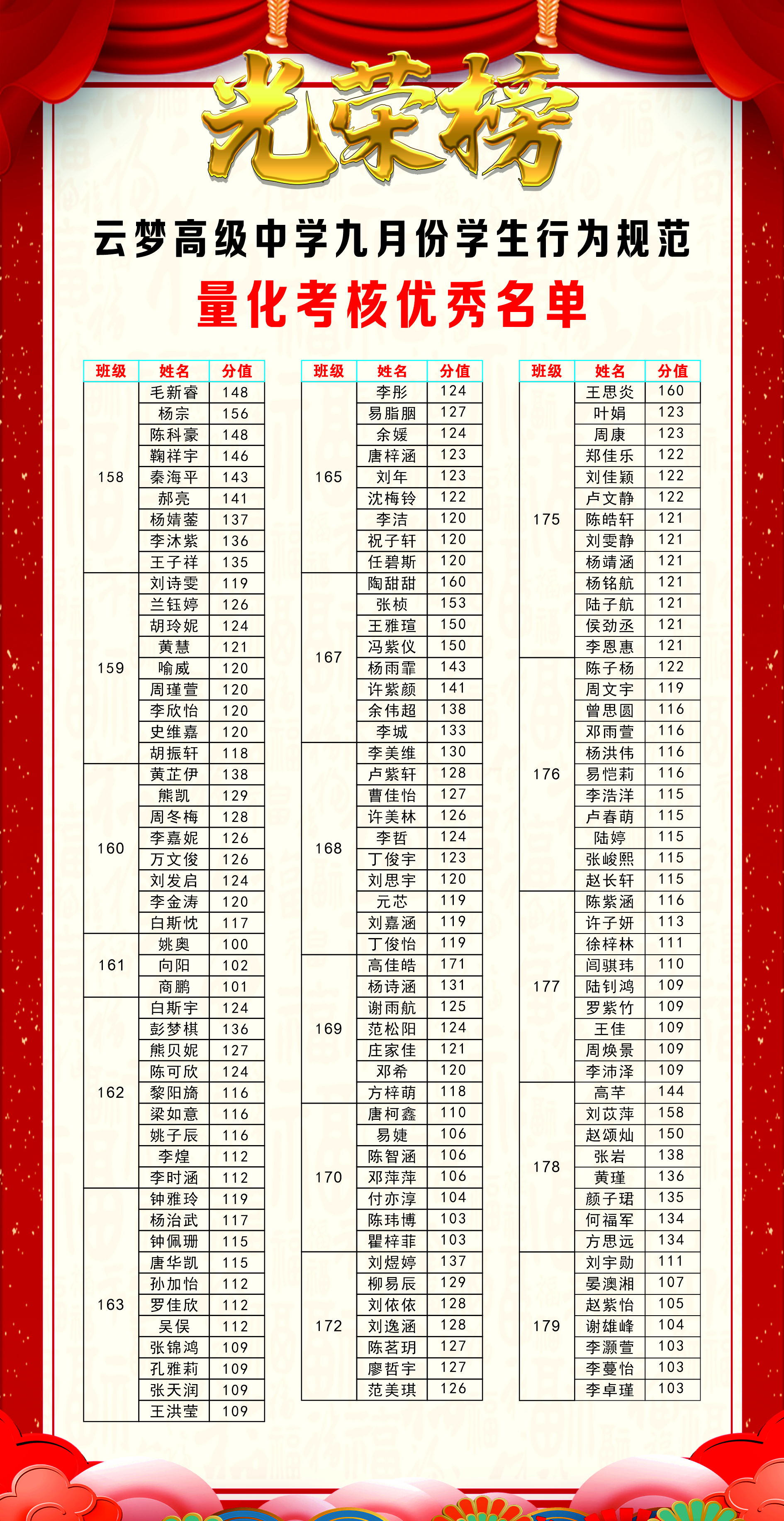 现在,让我们共同揭晓这份用努力书写的荣誉,为九月份最闪亮的“行为规范之星”喝彩;让我们共同践行“进步就是好学生,提高就是一百分”的理念。十月份的光荣榜,期待你的名字!