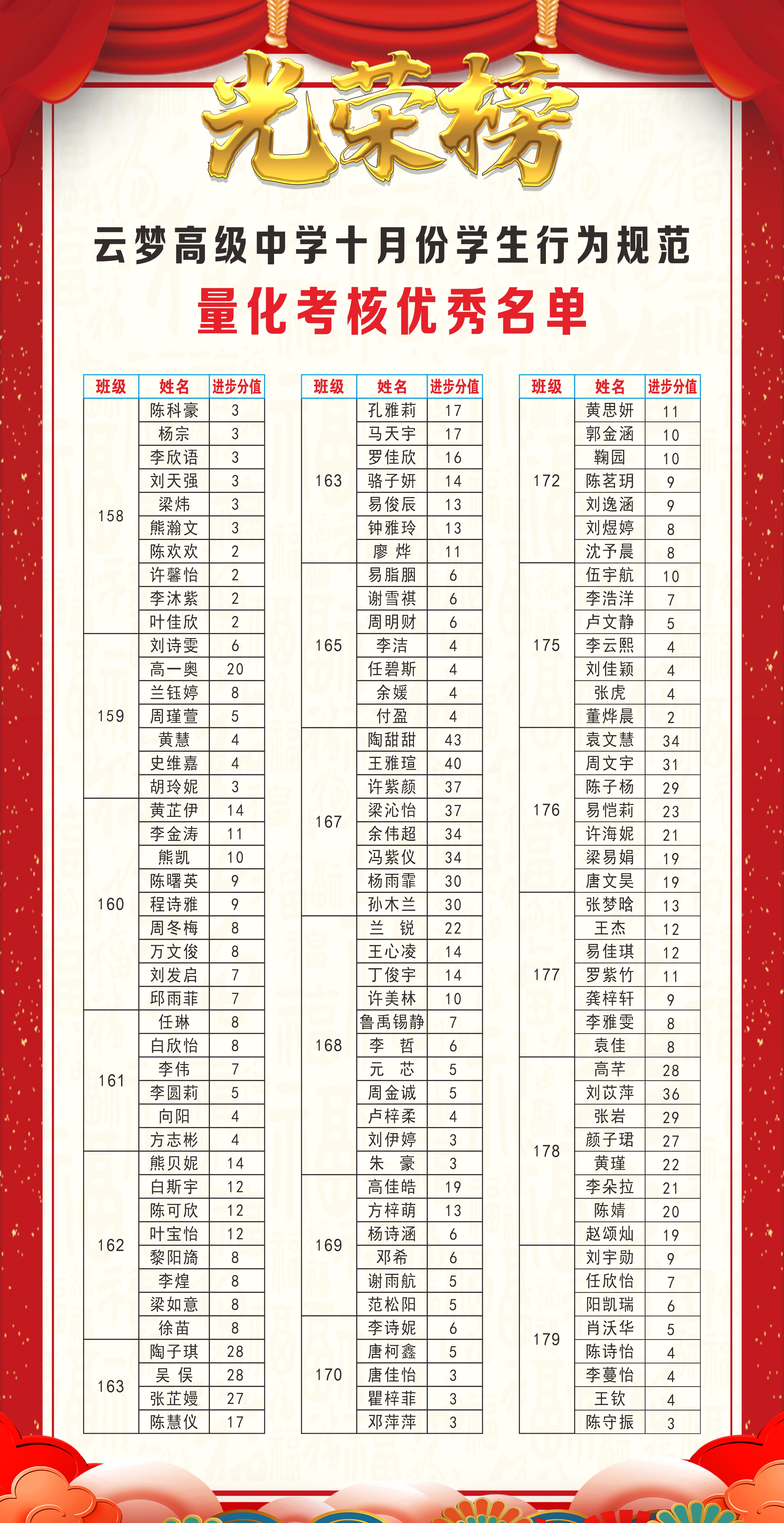 金秋十月,是收获的季节,也是成长的时节。在过去的一个月里,我们通过行为规范量化考核,见证了无数令人欣喜的进步与改变。每一天的记录,都在诉说着成长的故事;每一周的数据,都在描绘着进步的轨迹。今天,我们要特别表彰那些在十月份行为规范方面进步显著的同学,他们用实际行动为全校同学树立了可学可做的榜样。