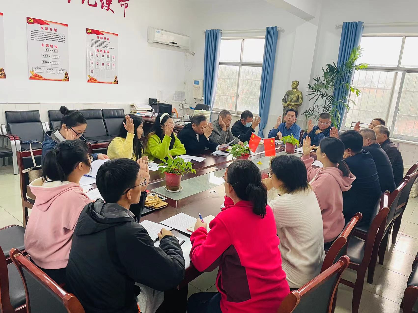 李书记就黄珊老师加入党组织的决议进行举手表决,18位党员表决,全体通过;彭军主席作为介绍人,观察其思想动态,并进行帮扶,及时做好思想汇报。