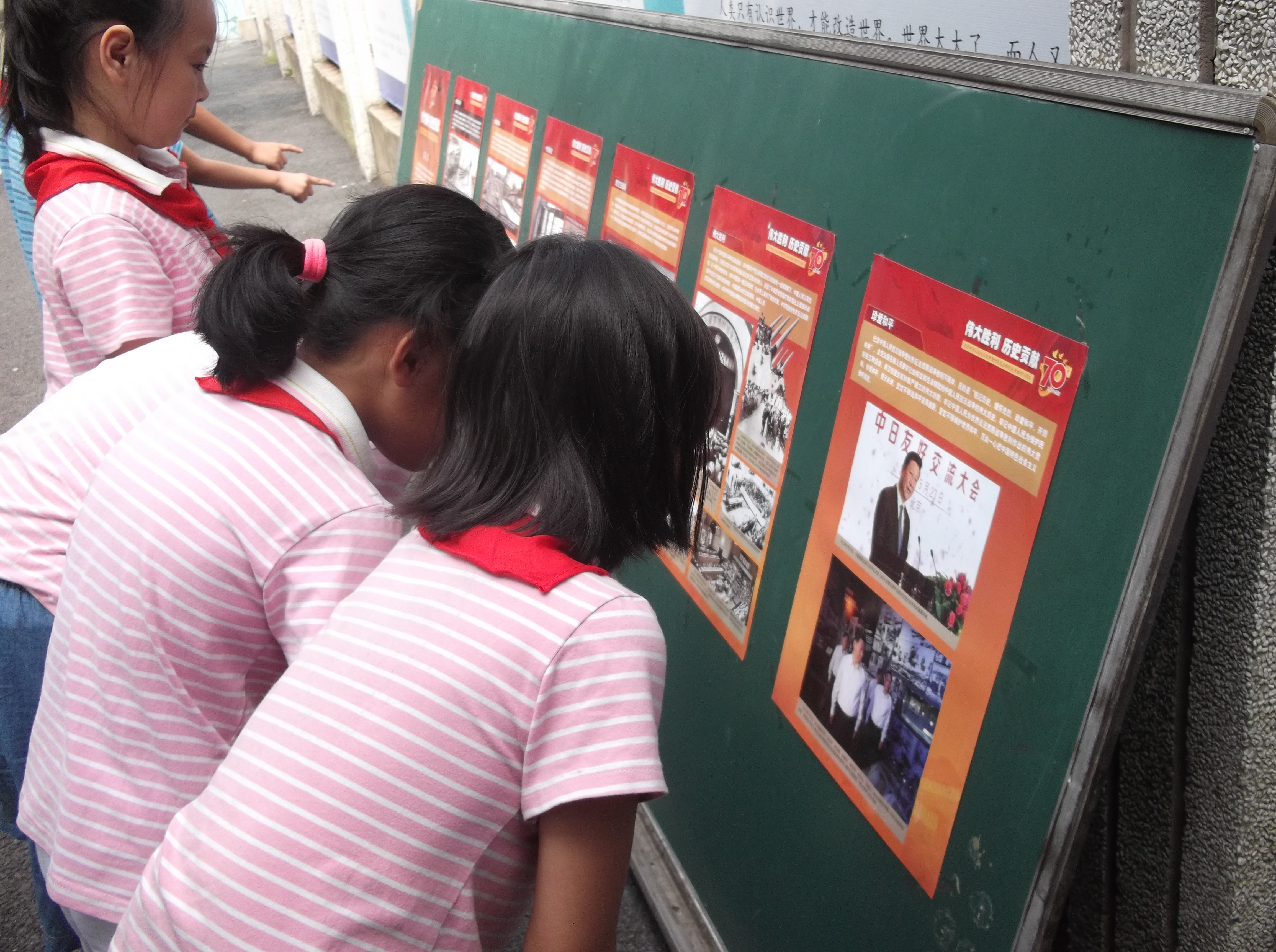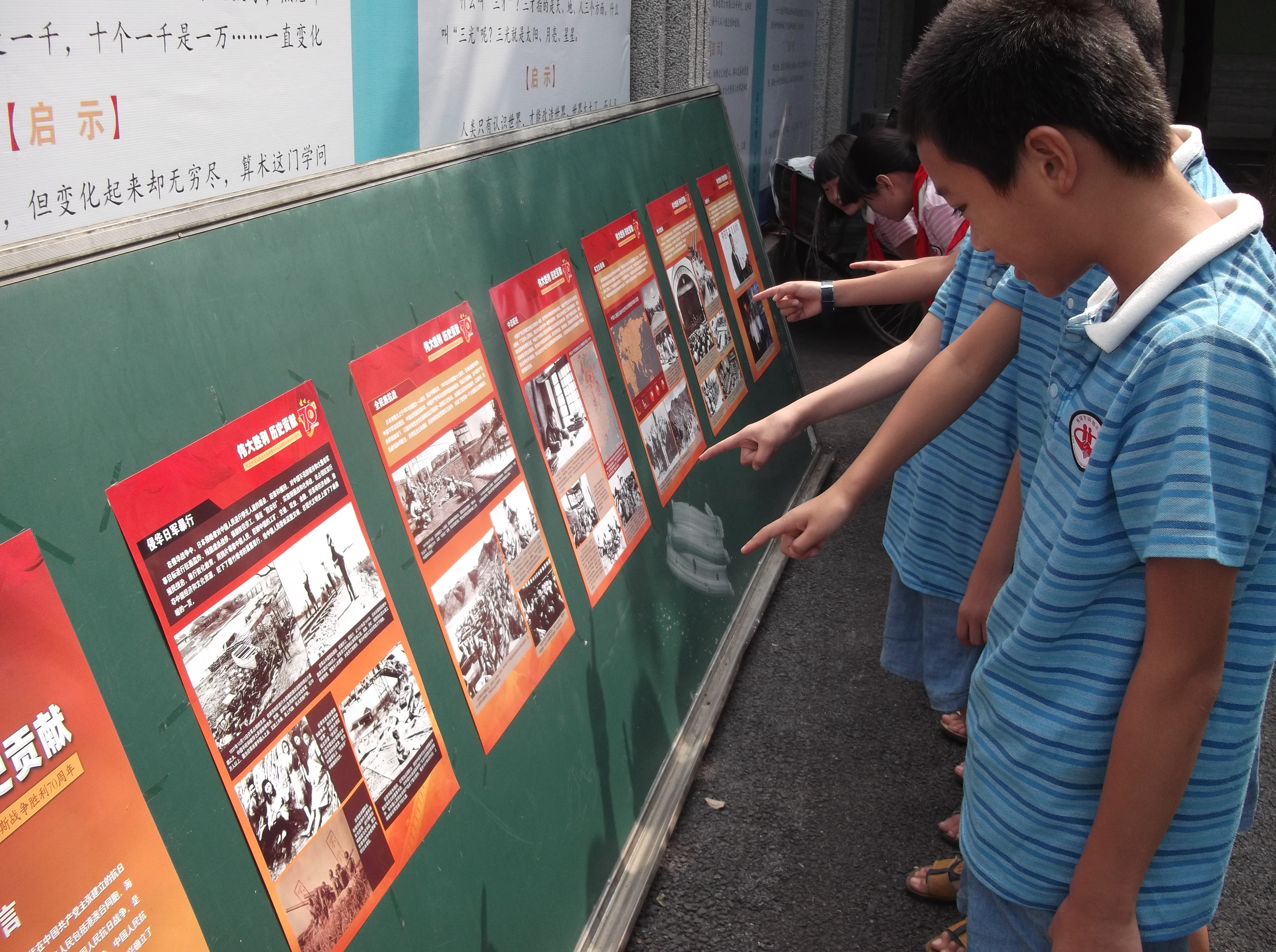 今年是全民族抗日战争暨世界反法西斯战争胜利70周年。根据教育局的工作安排,我校在校园内展出抗日战争胜利宣传挂图,并组织各班同学观看。