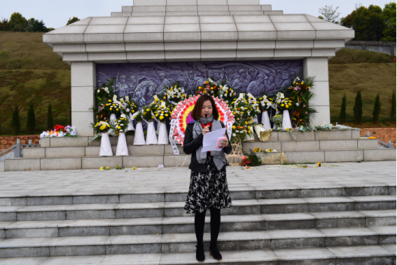活动中,队员们用一曲《中国少年先锋队队歌》和一首《囚歌》诗表达了对革命烈士的缅怀和崇敬之情,随后队员们敬献花圈并默哀,同学们纷纷表示要向革命先烈学习,继承先辈们的优秀传统,发扬刻苦拼搏精神,努力学习,掌握科学知识,树立远大的理想,为建设祖国时刻准备着。 大队辅导员蒋老师就此次活动对学生们提出几点希望 学生代表讲话 栖凤亭社区部分志愿者跟随我校共同参加此次活动 学生为烈士献花