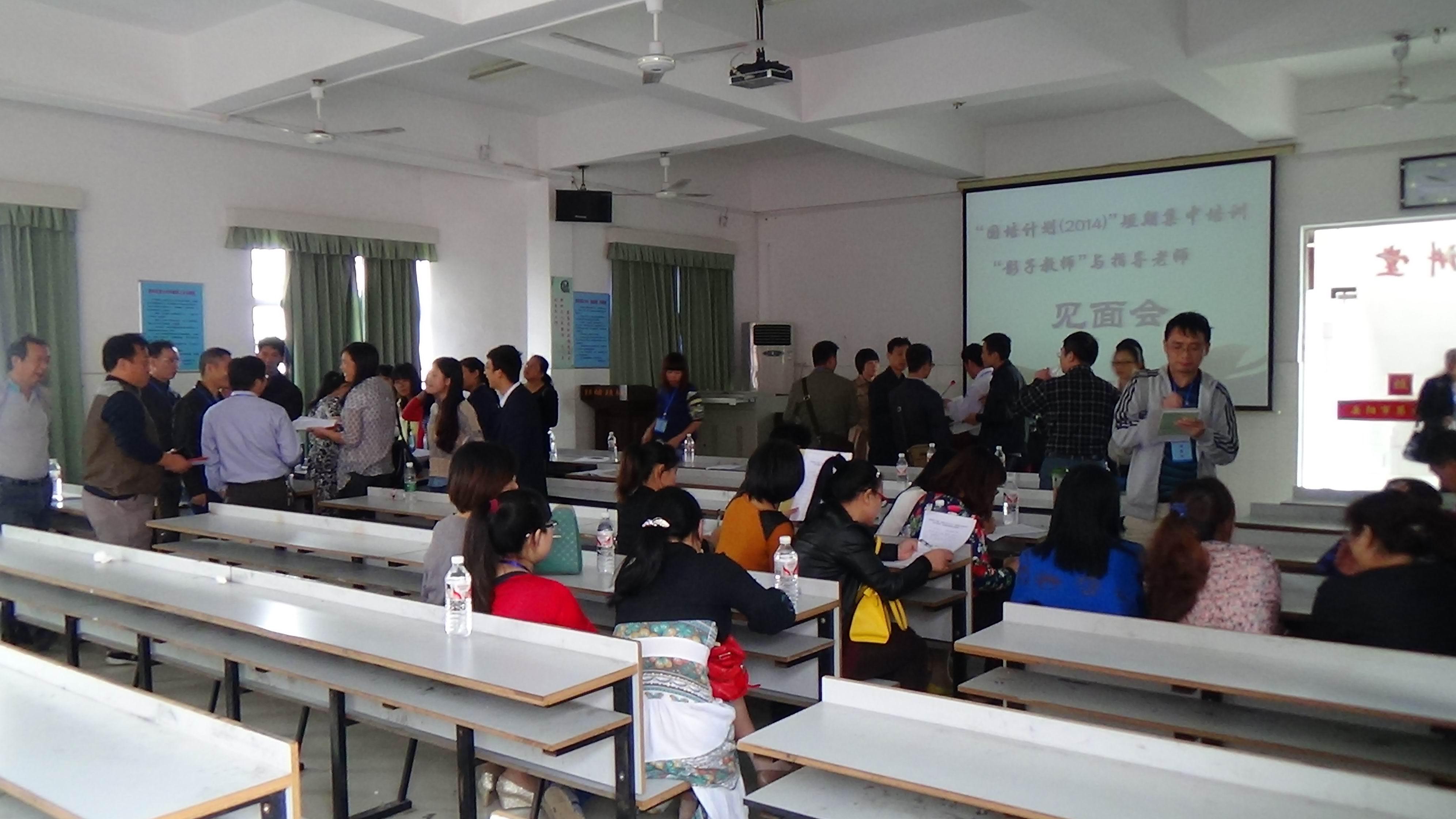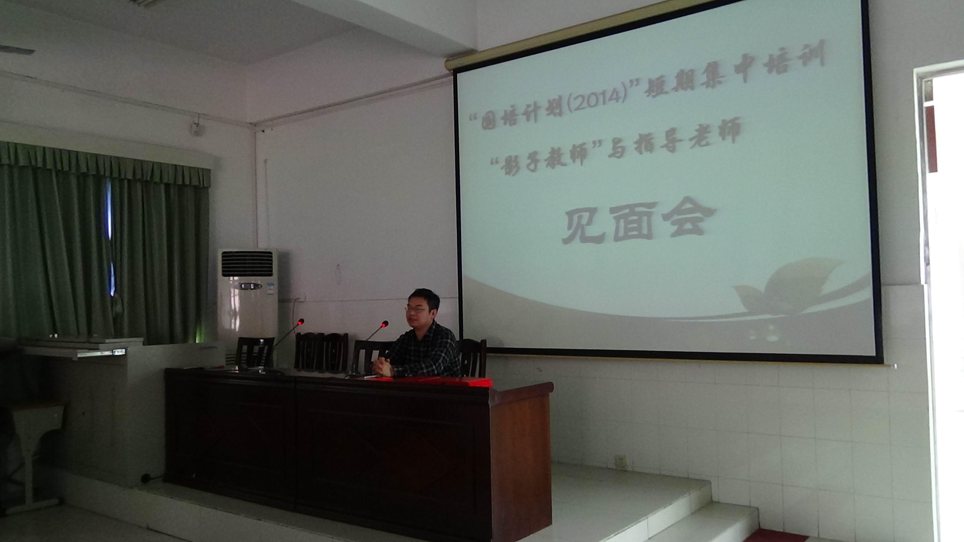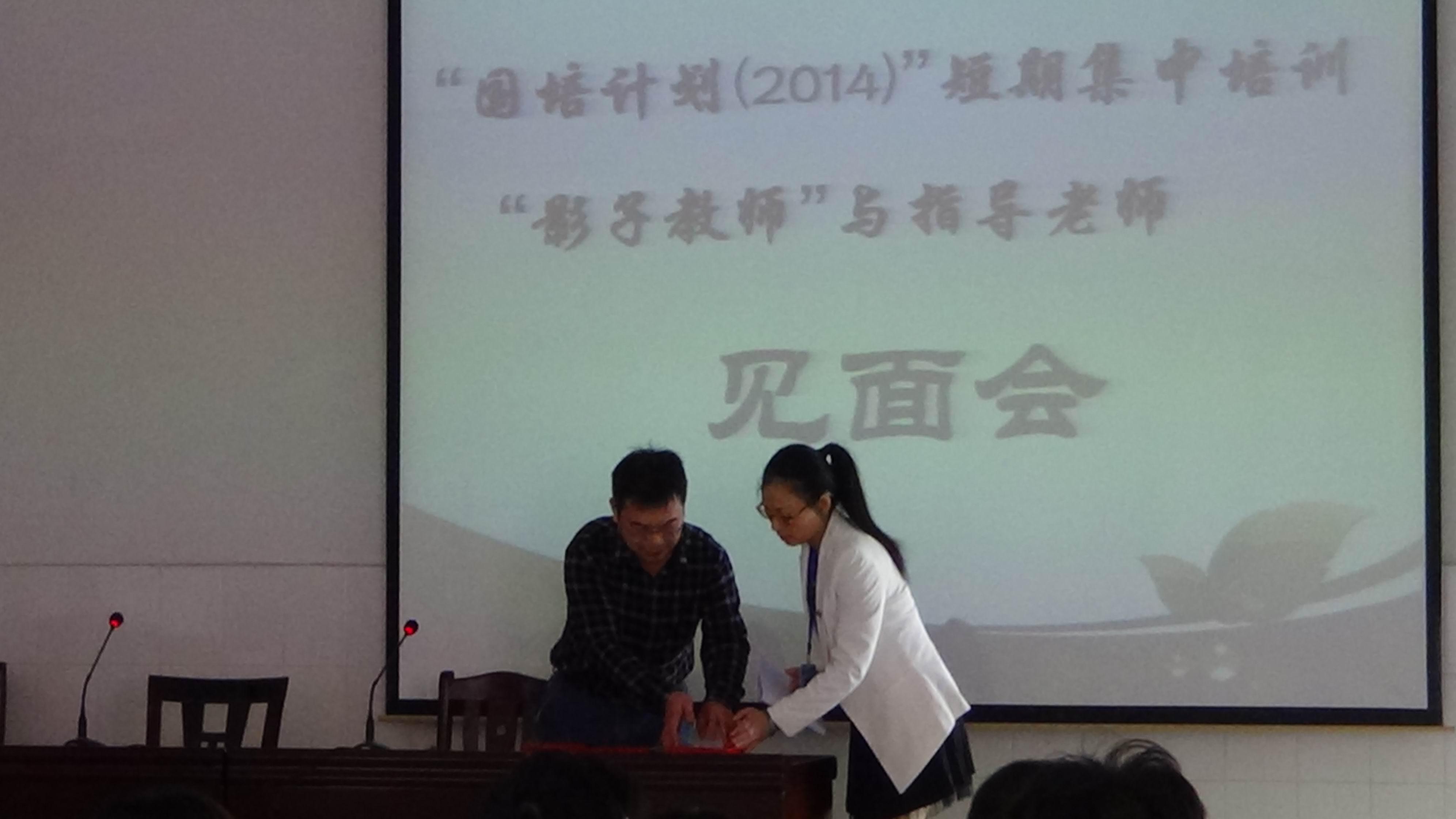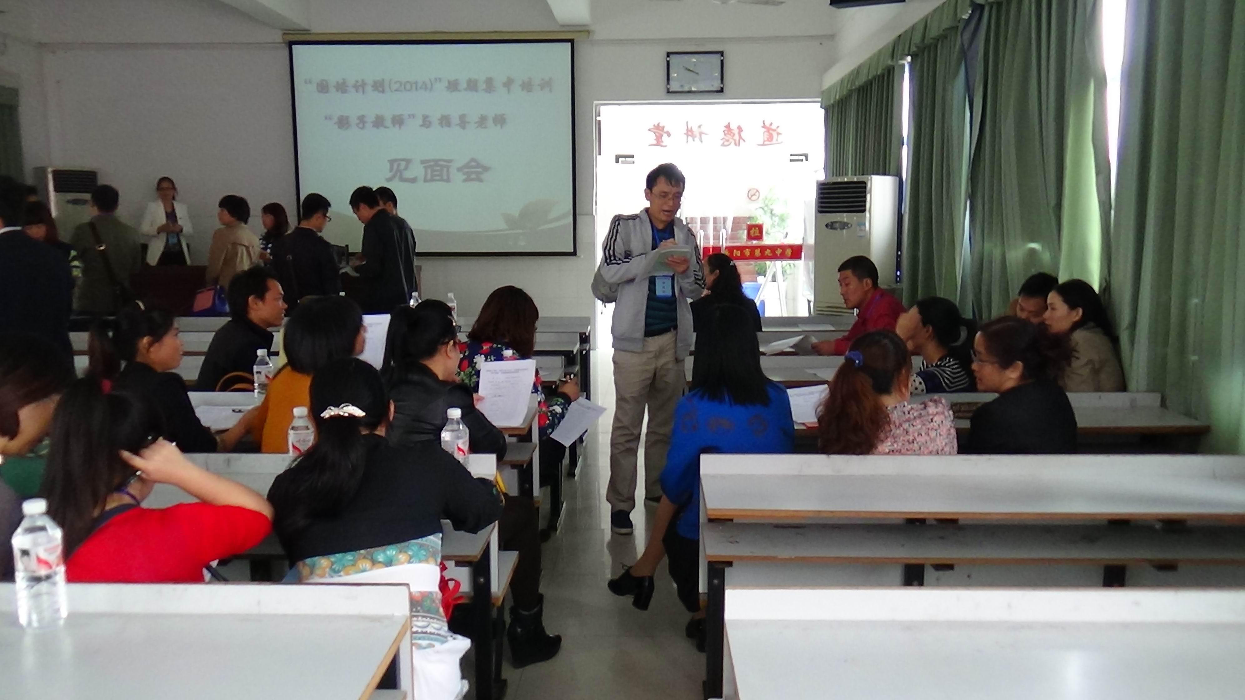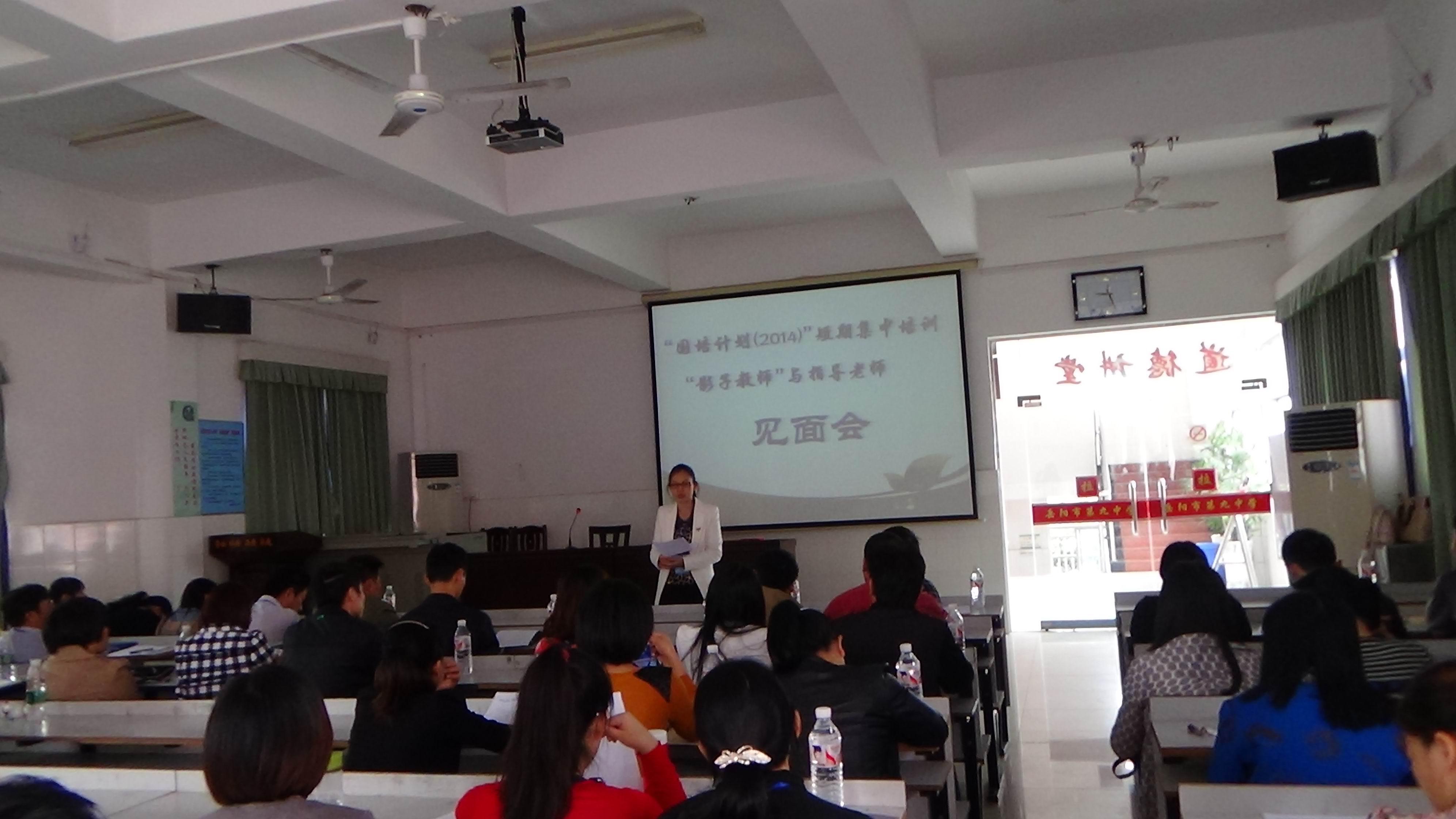 2014年10月13日,岳阳市第九中学迎来了参加湖南理工学院国培计划(2014)第一批“影子教师”短期集中培训的40名学员。上午9点,在(一)会议室召开了学员与指导老师的见面会。首先,任畅主任对实践活动做出了整体安排;之后,理工学院中文学院蒋晓城书记对学员的实践活动提出了具体要求,并颁发了指导教师证书;最后,学员与指导老师进行了面对面的交流。