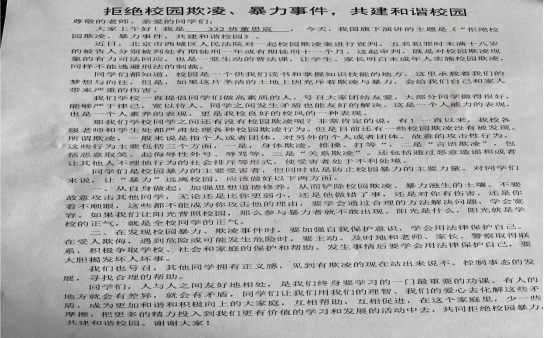 三是学校于9月26日举行了一次“拒绝校园欺凌、暴力事件”主题开旗仪式。325班学生董思宸作国旗下讲话,全校学生参加活动。