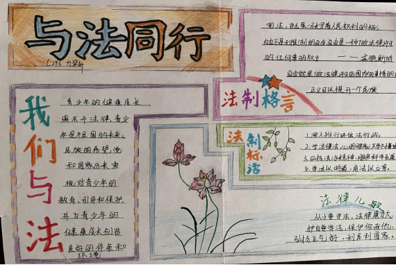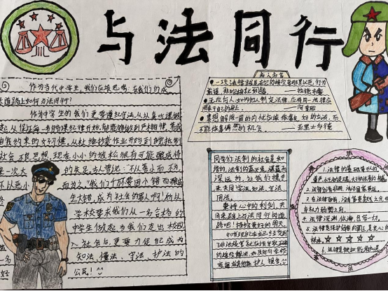 四是组织一次法治主题手抄报评选活动。学校于9月24日--30 日组织全校各班级制作法治教育主题手抄报,经班级、年级组初评,每班向政教处报送5张优秀作品,政教处评选出8名一等奖,10名二等奖,12名三等奖并予以表彰。