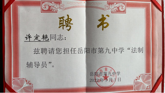 六是聘请岳阳楼区公安分局三眼桥派出所教导员许定艳为“法制副校长”,定期为学校师生进行普法教育。