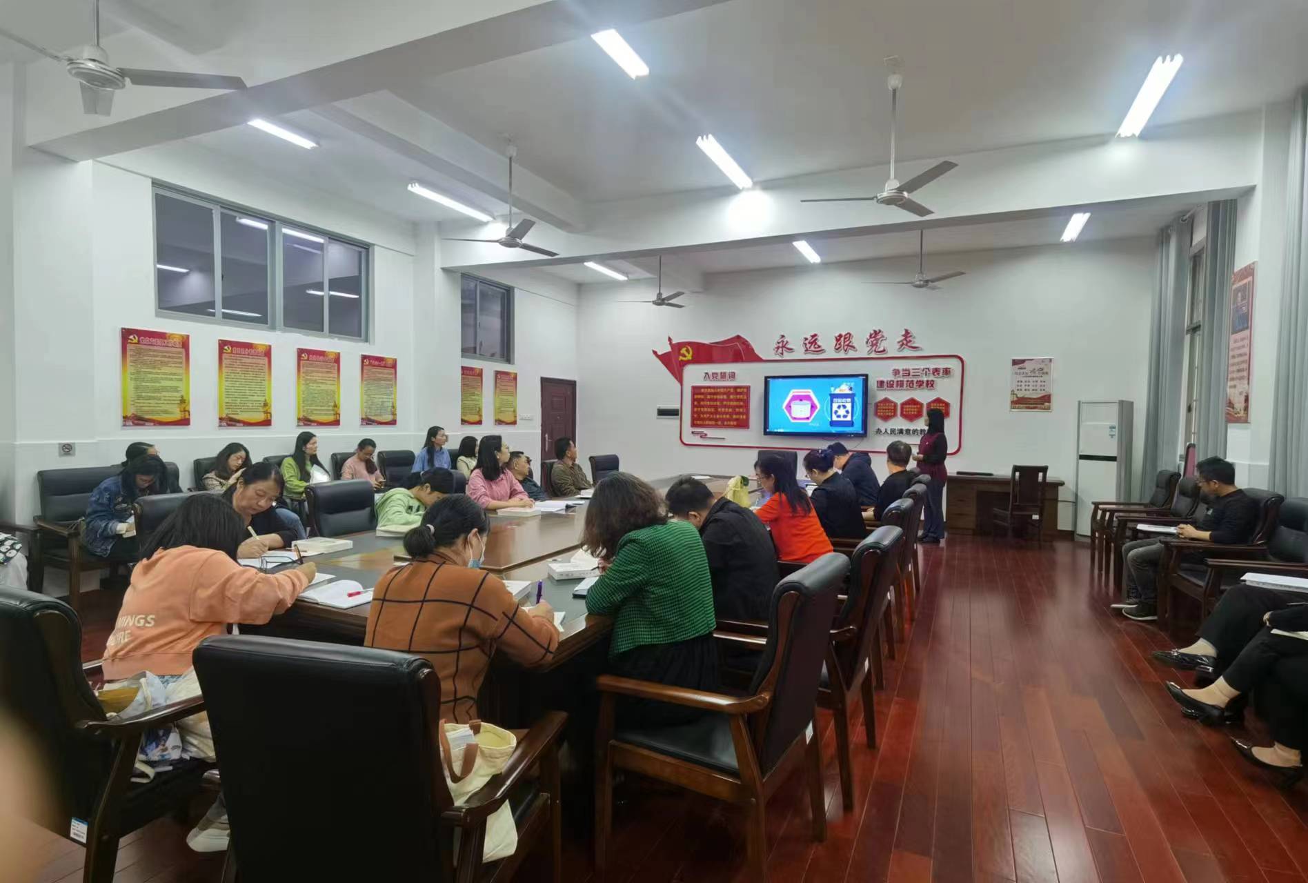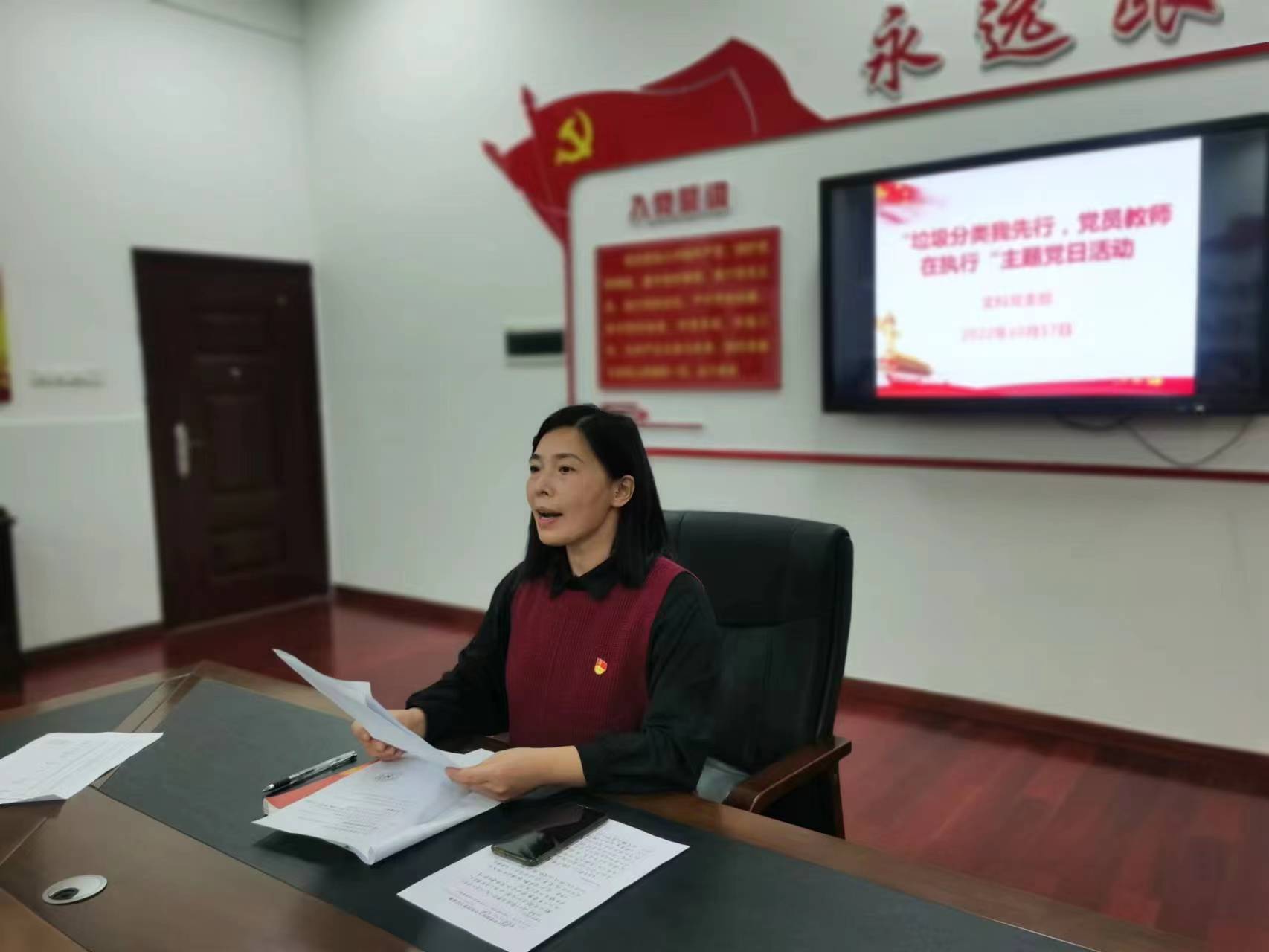 任新宇在党员大会强调,党员教师要带头遵守垃圾分类有关法规政策和工作要求,增强环境和责任意识、掌握垃圾分类知识、提高垃圾管理能力,积极参与、率先垂范,让主动分类、自觉投放成为生活习惯和行为自觉,通过身体力行影响身边人共同参与到垃圾分类工作中,从自身做起、从小事做起、从现在做起,共同建设绿色校园。